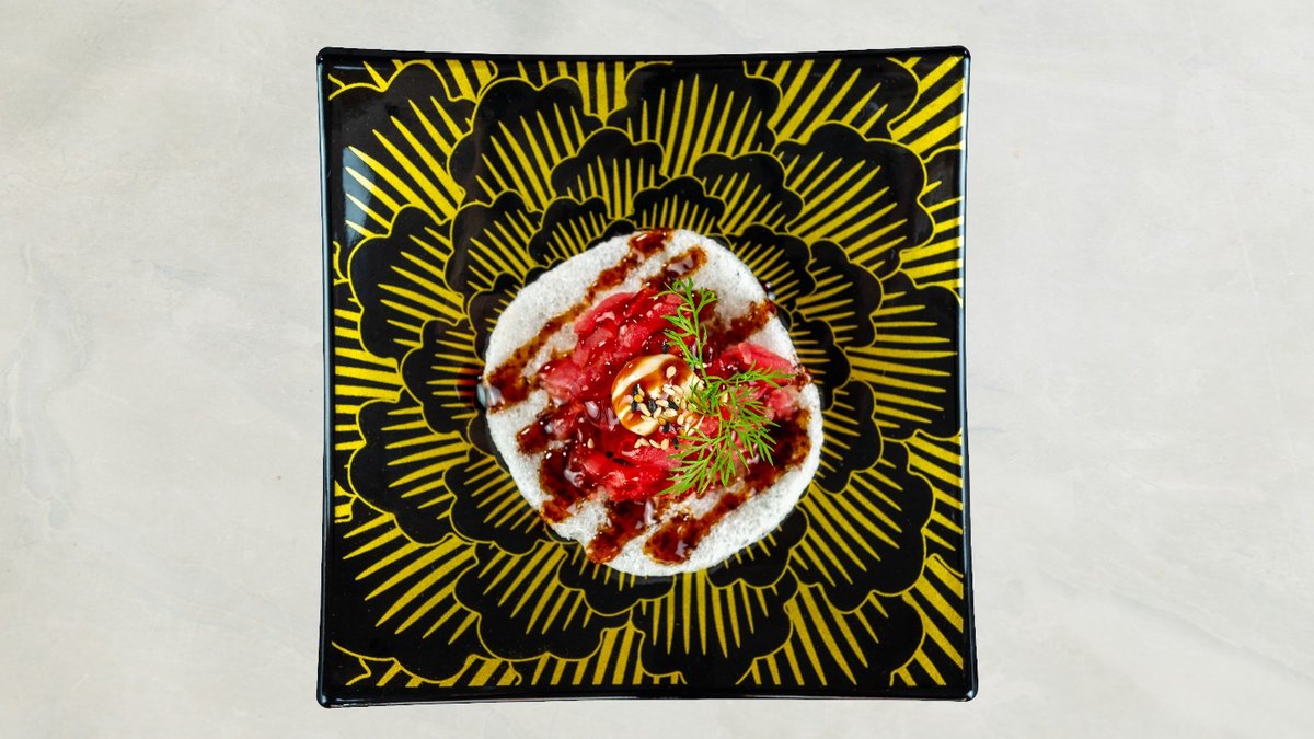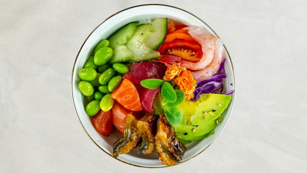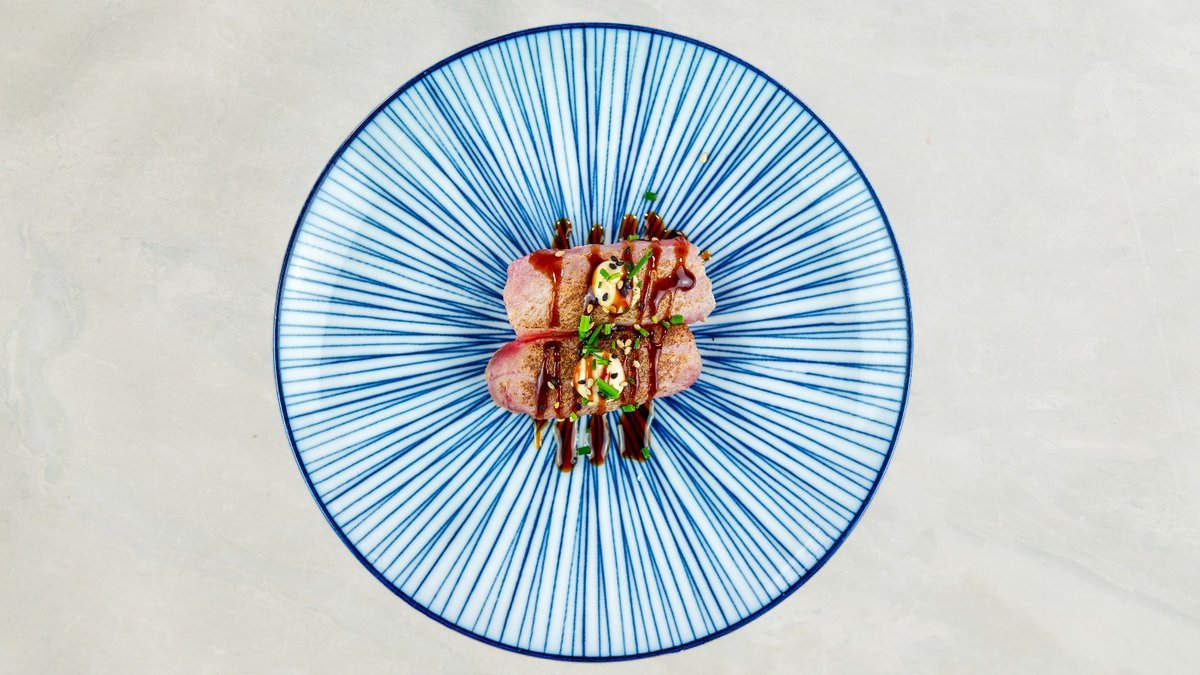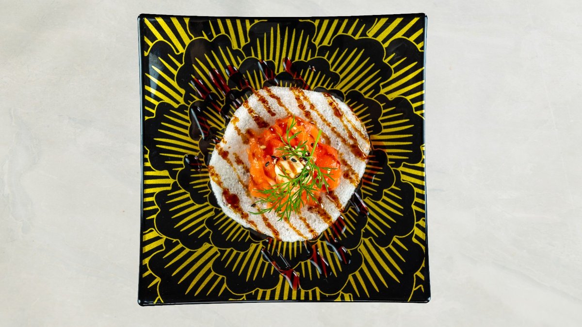 Tempura rejer, avocado, chili mayo, toppet med sesam og teriyaki.