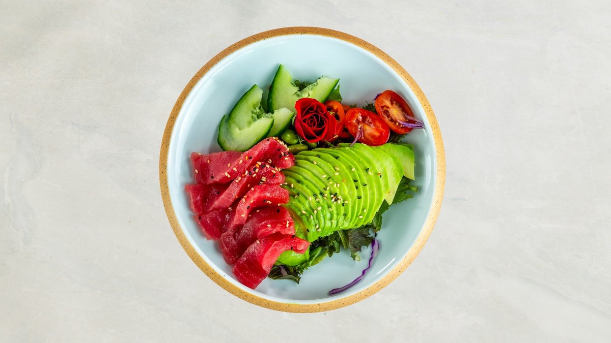Laks, avocado, agurk, chili mayo, toppet med sesam.