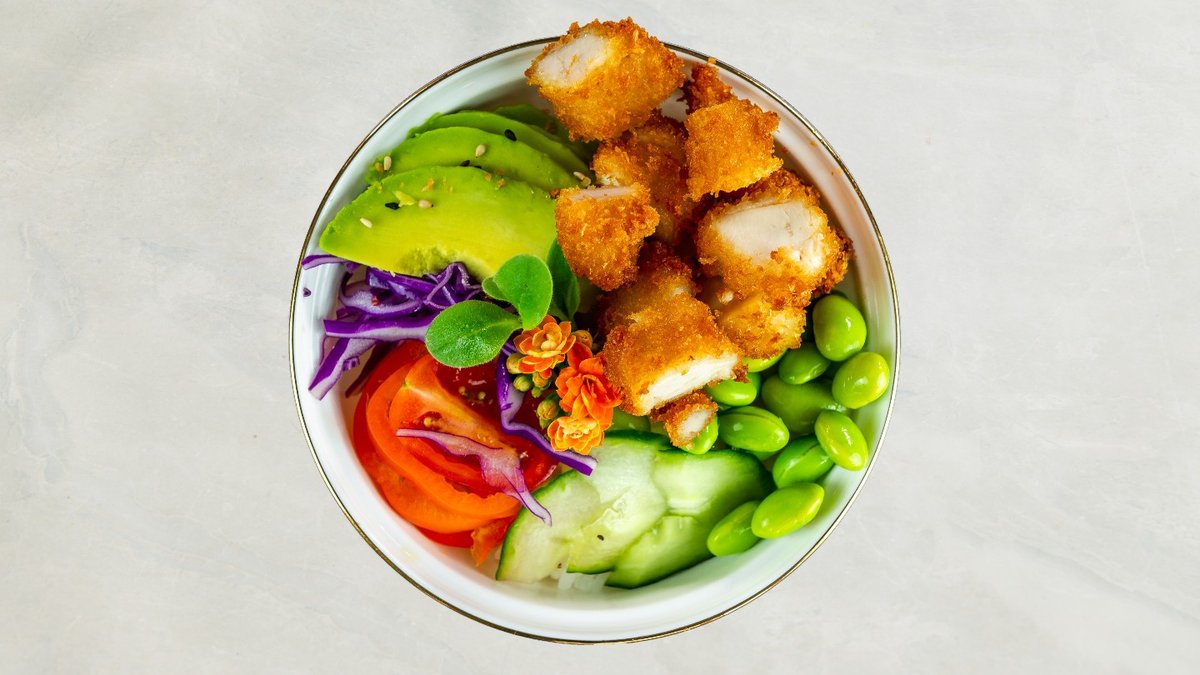 Tempura chicken, agurk, toppet med sesam, teriyaki og forårsløg.
