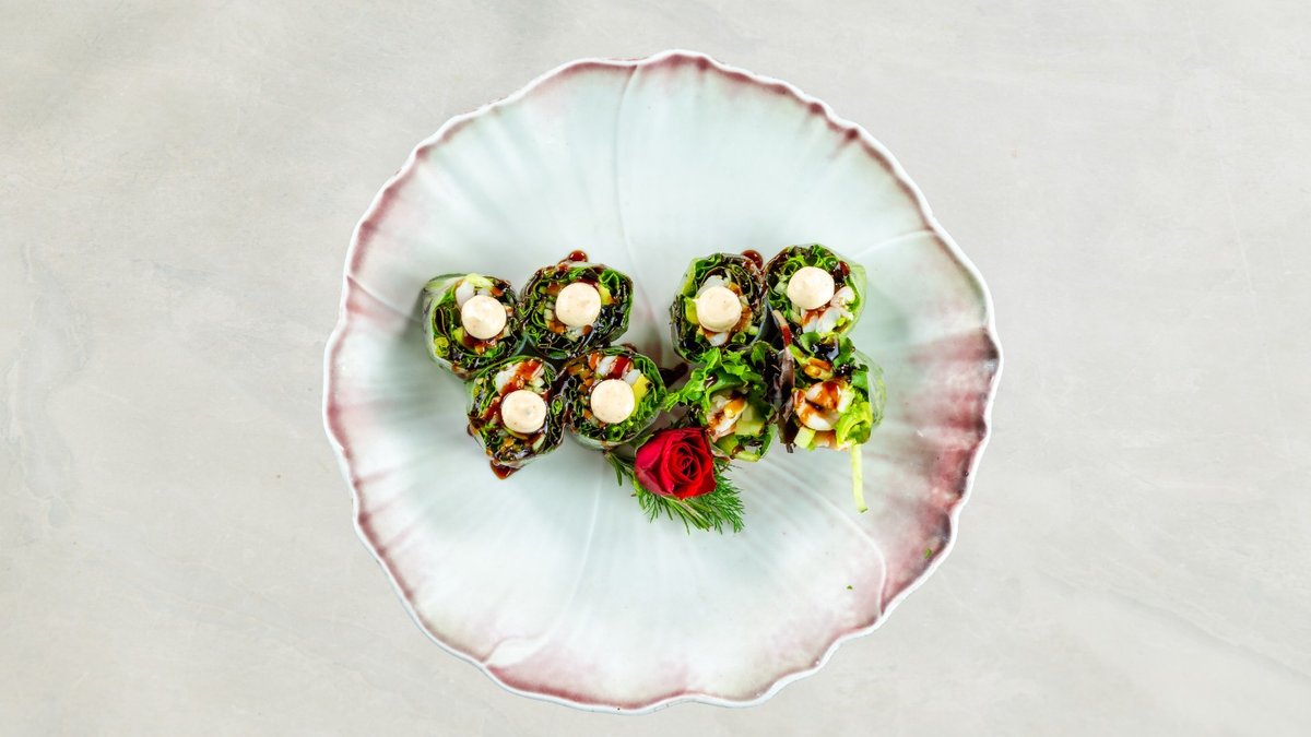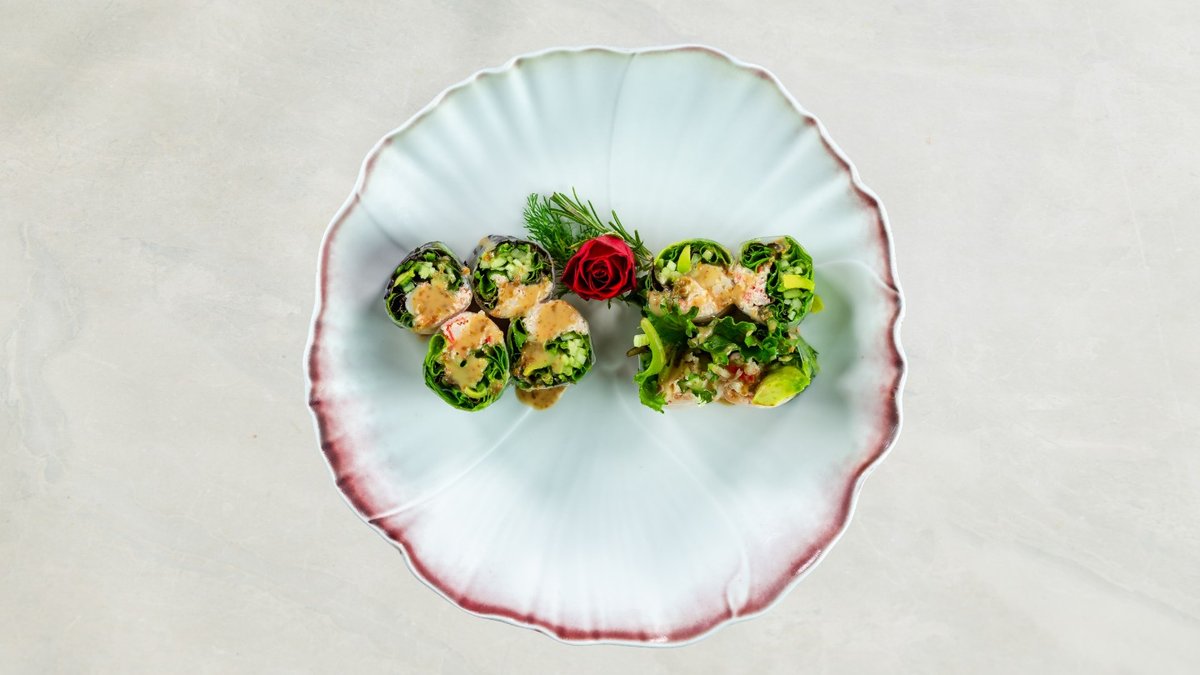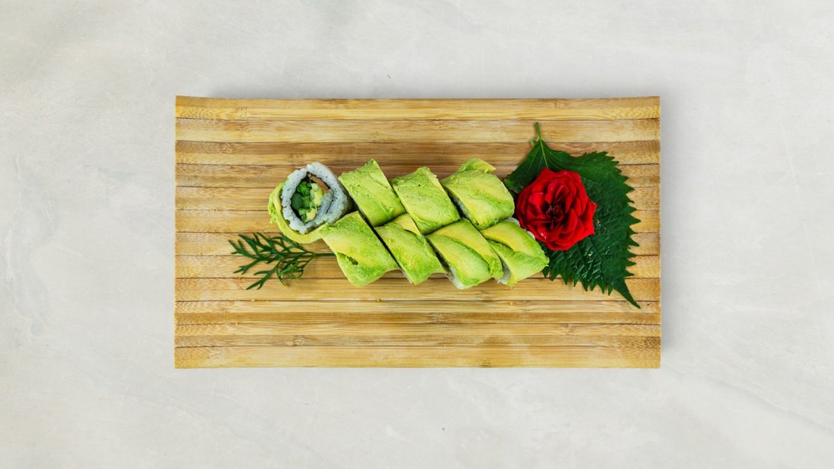 Kaburimaki: 8 stk veggie dragon Nigiri: 1 stk mango, 1 stk asparges, 1 stk avocado og 1 stk tofu. Serveres med tangsalat