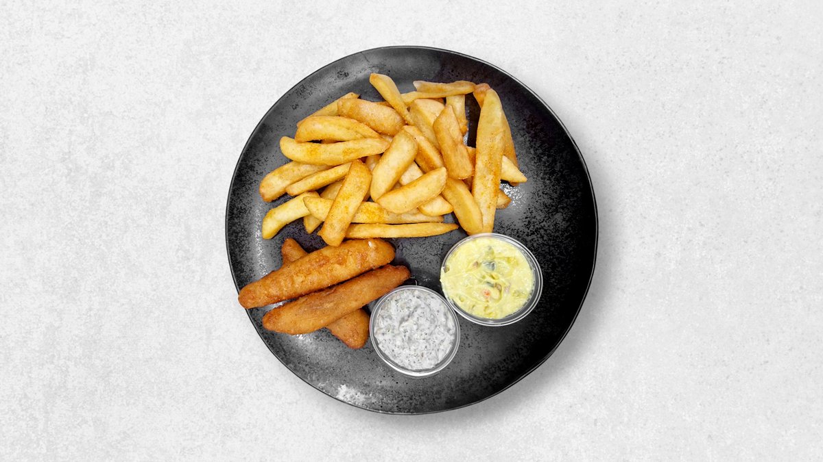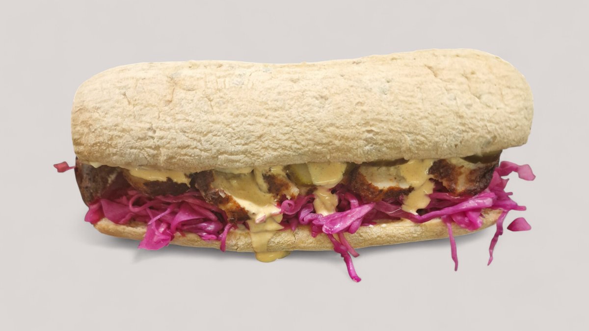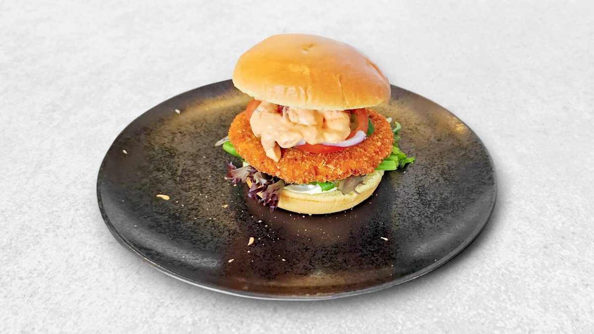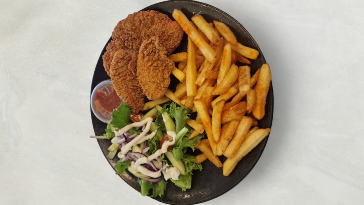 Kyllingebøf i en briochebolle med salatmayonnaise, sprød chips salat, rødløg, agurk, tomat og hjemmelavet rød dressing. Serveres med kartofler, dyppelse og en valgfri drikkevare.