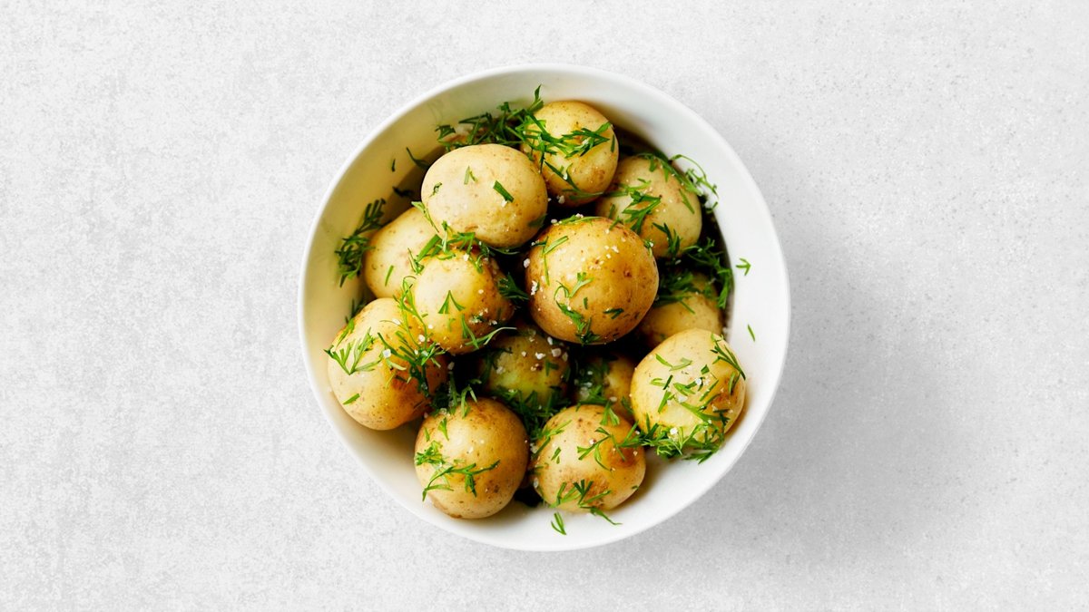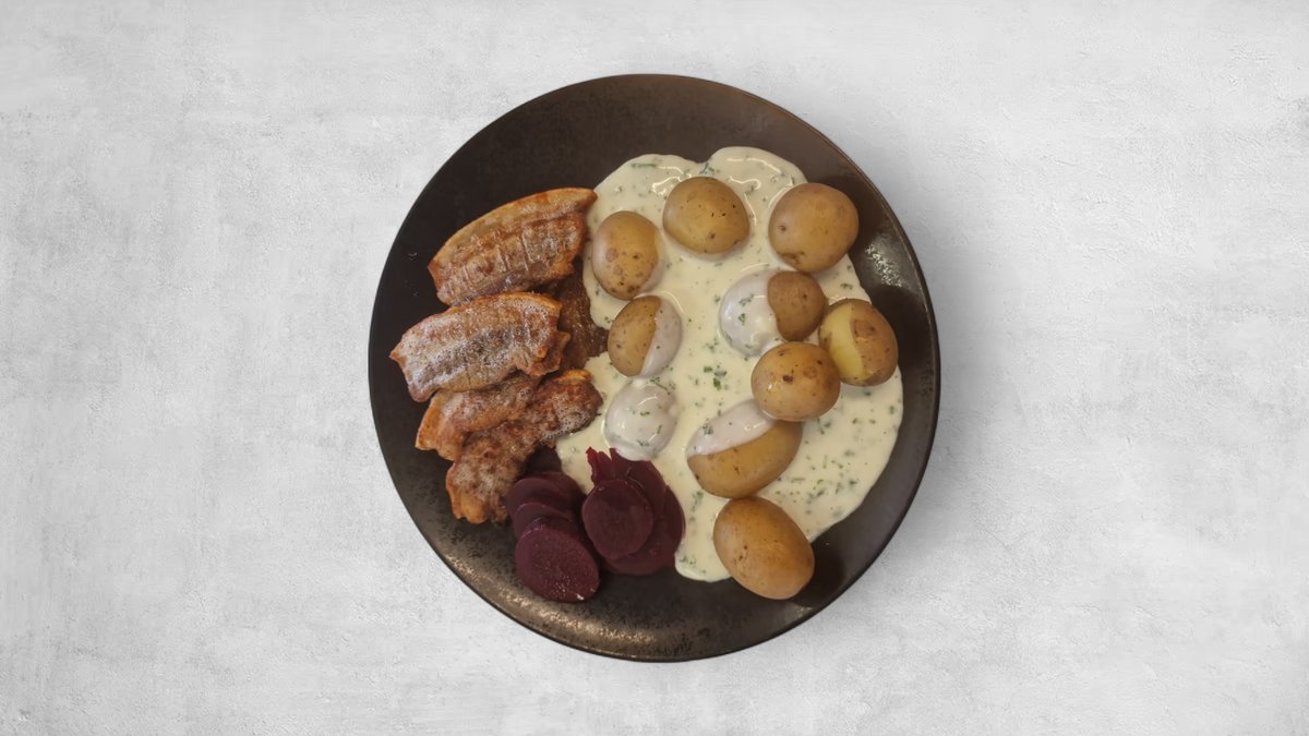 Serveres med persillesovs, hjemmesyltede rødbeder og kartofler.