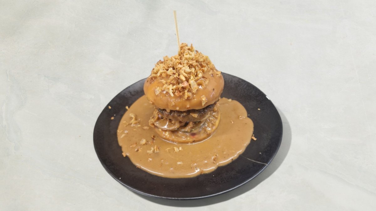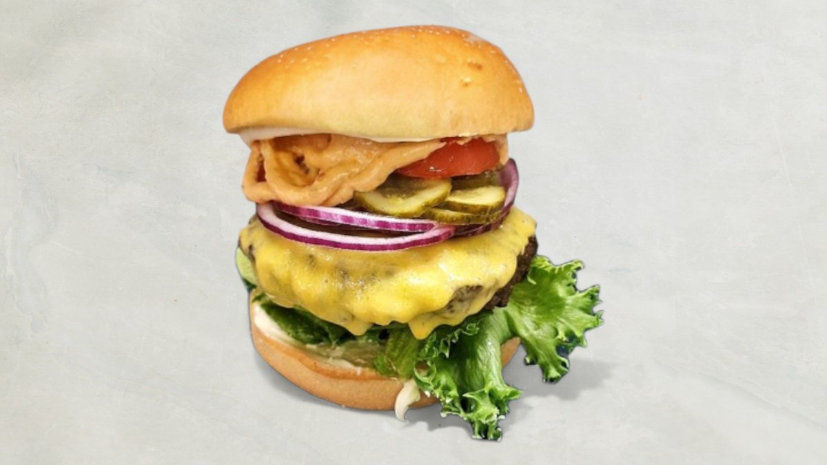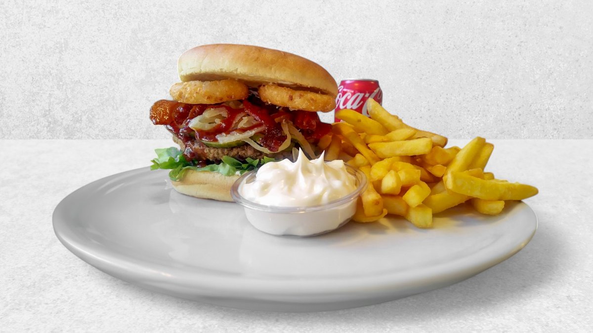Hakkebøf i brioche bolle med bløde løg, bacon, indbagte løgringe, hjemmesyltet agurk, salat, barbecuesauce og mayonnaise. Serveres med kartofler, dyppelse og en valgfri drikkevare.