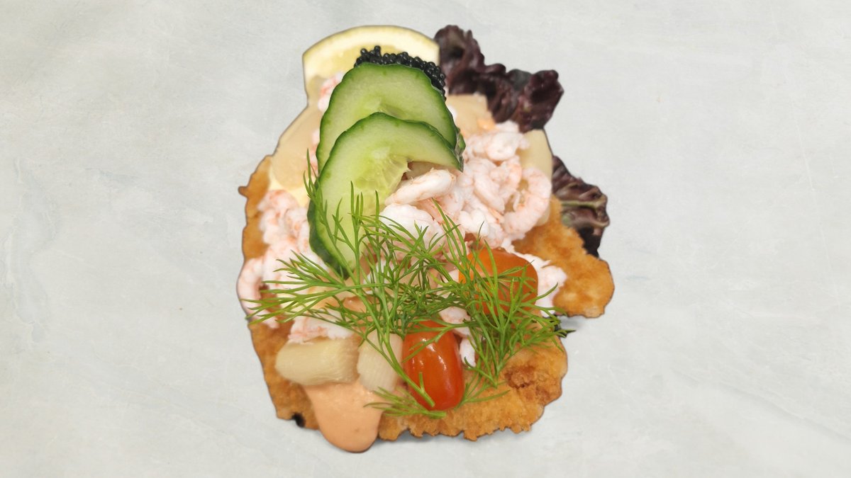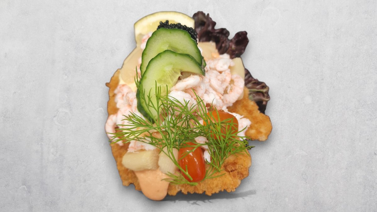 To lækker stjerneskud med 2 pankopaneret rødpættefilet asparges toppet med rejer pyntet med agurk og tomat, citron og caviart og en god flaske hvid vin.