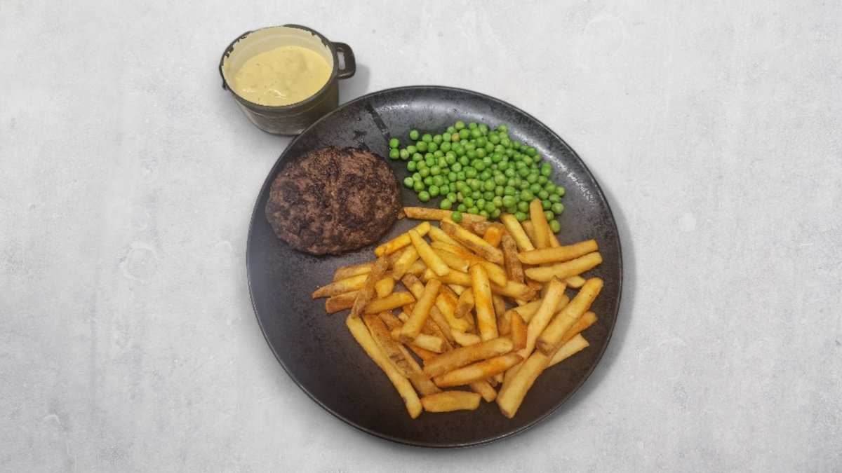 Lækker 200 g hakkebøf, med ærter og pomfritter