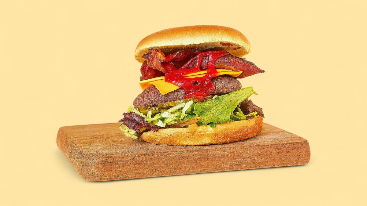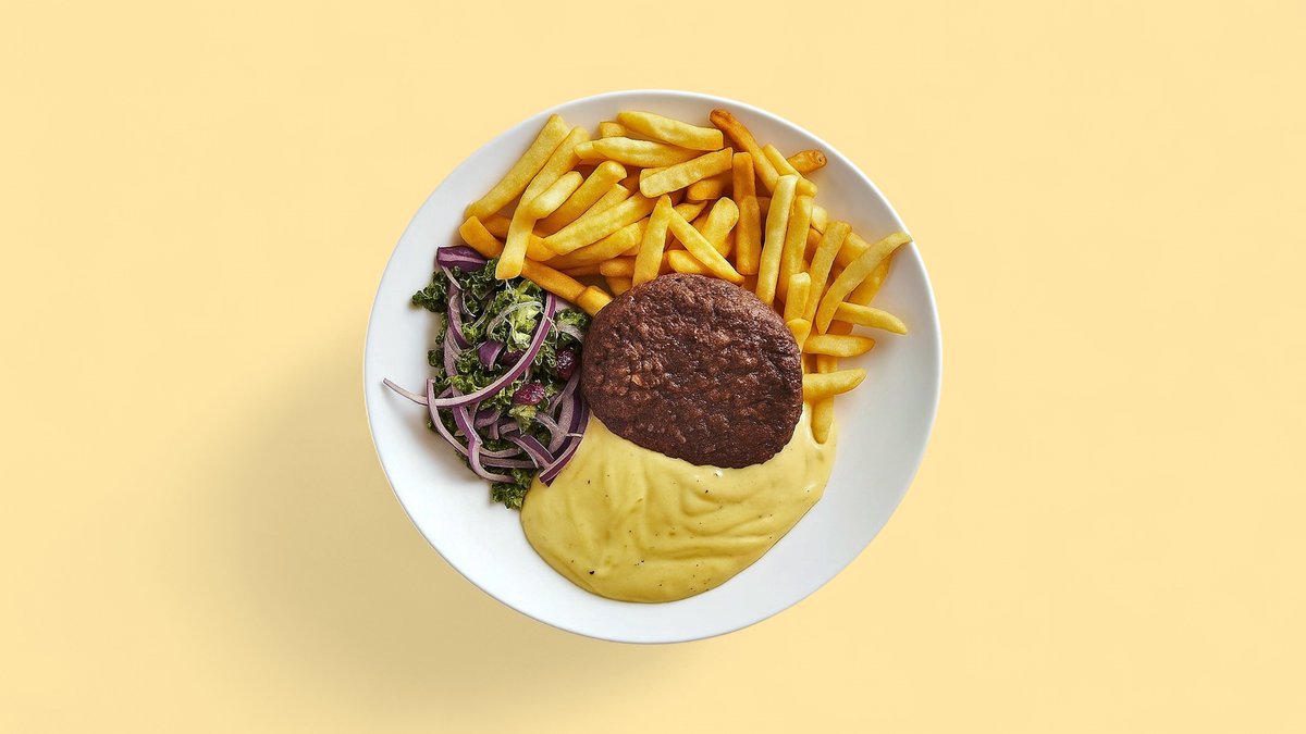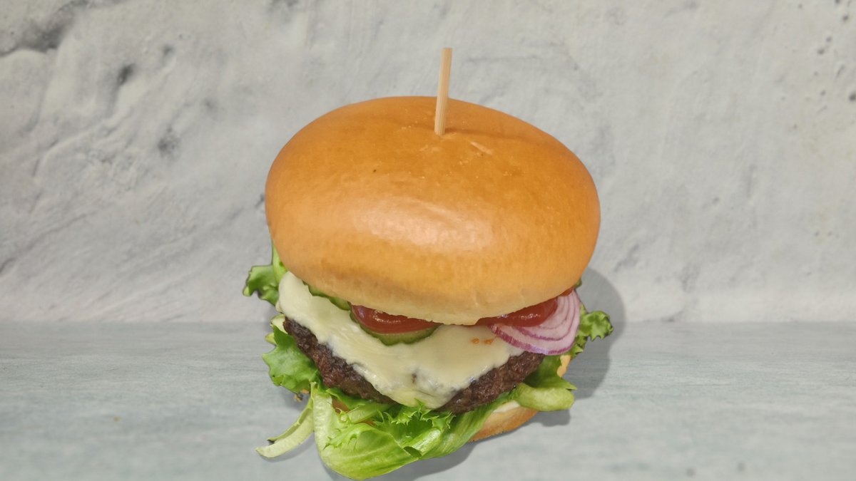 Hakkebøf i brioche bolle med ost, bacon, salat, hjemmesyltede agurker, rødløg, ketchup og mayonnaise. Serveres med kartofler, dyppelse og en valgfri drikkevare.