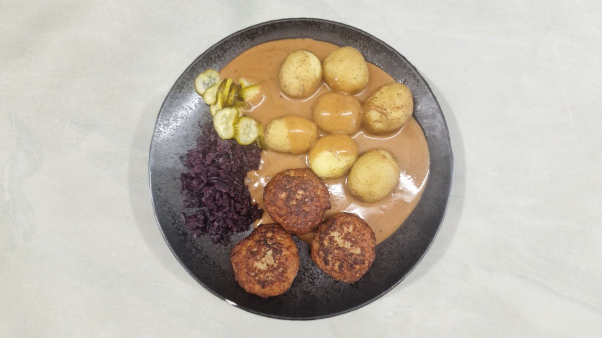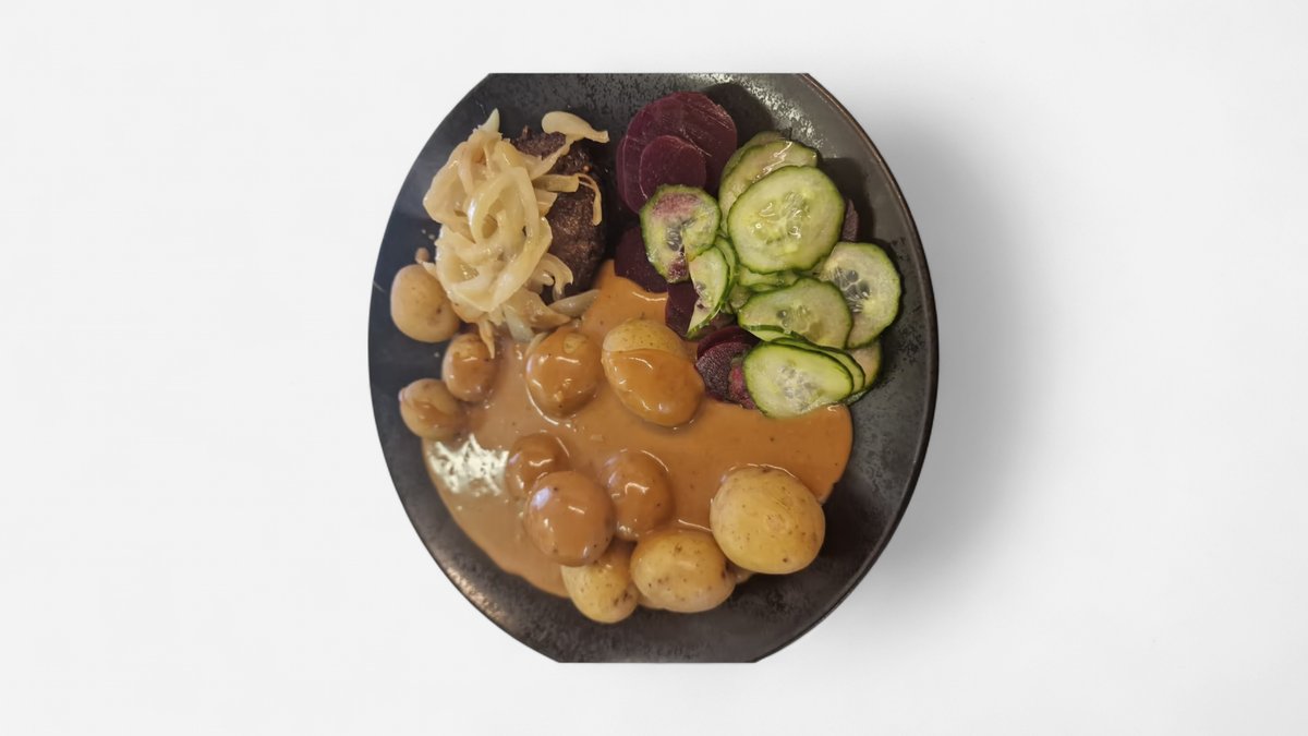 Hakkebøf af 200 gram oksekød med bløde løg og brun sovs. Serveres med hjemmesyltede rødbeder og kogte danske kartofler.