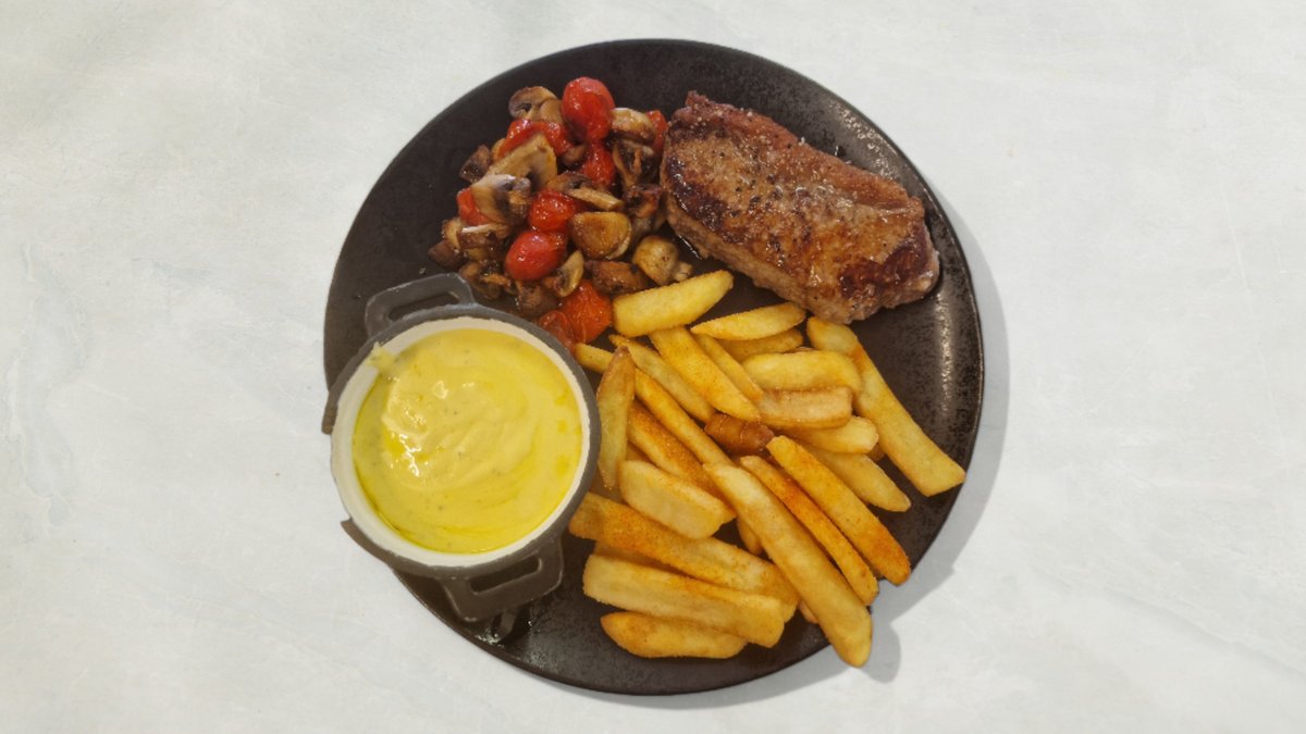 Lækker himmerlandkvæg steak med fritter og bearnaise sauce stegte svampe og bagt tomat med en lækker flaske huset rødvin.