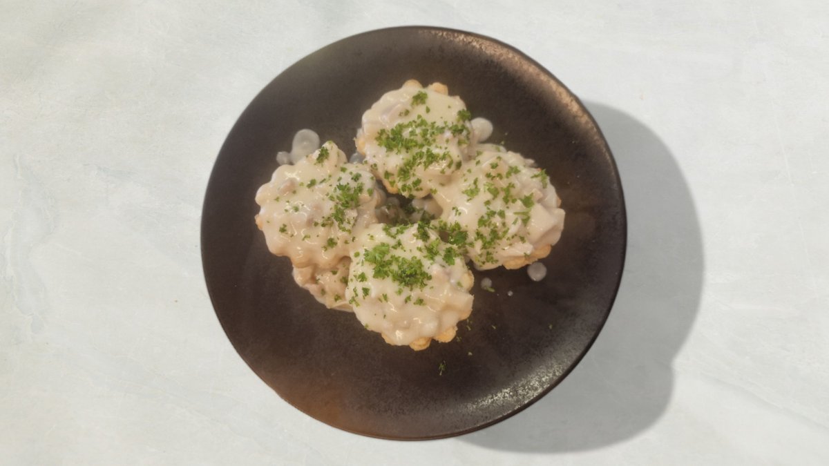 Tarteletter med fyld af hjemmelavet høns i asparges.