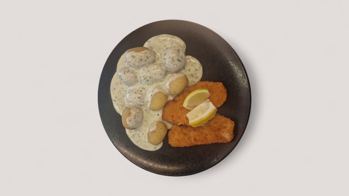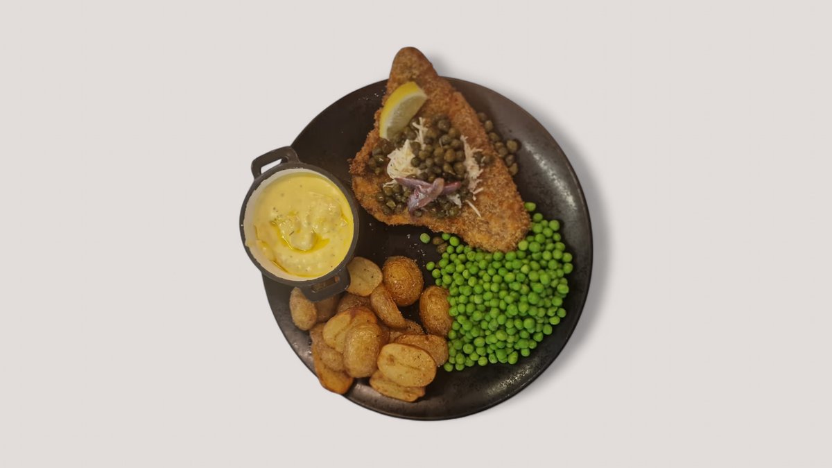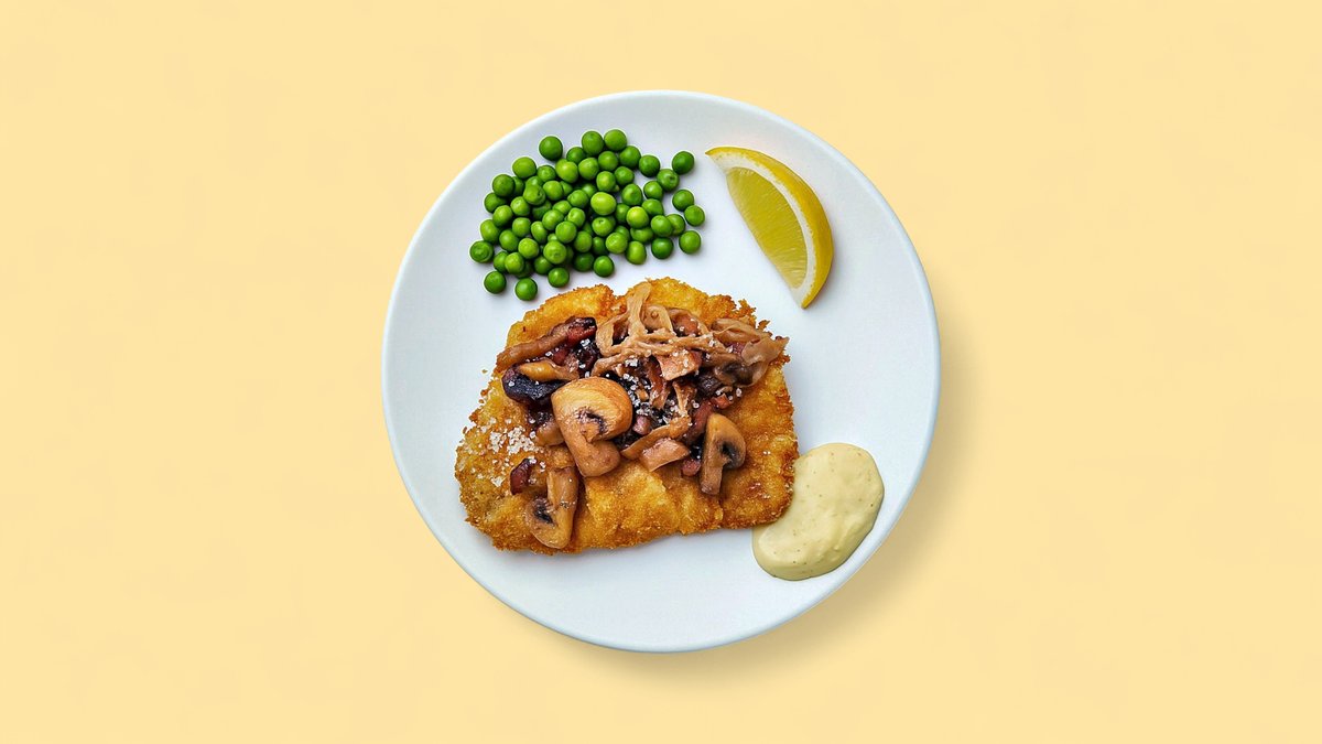 Paneret schnitzel af kalveinderlår serveret med sprøde ærter, wiener dreng samt valgfrit tilbehør.