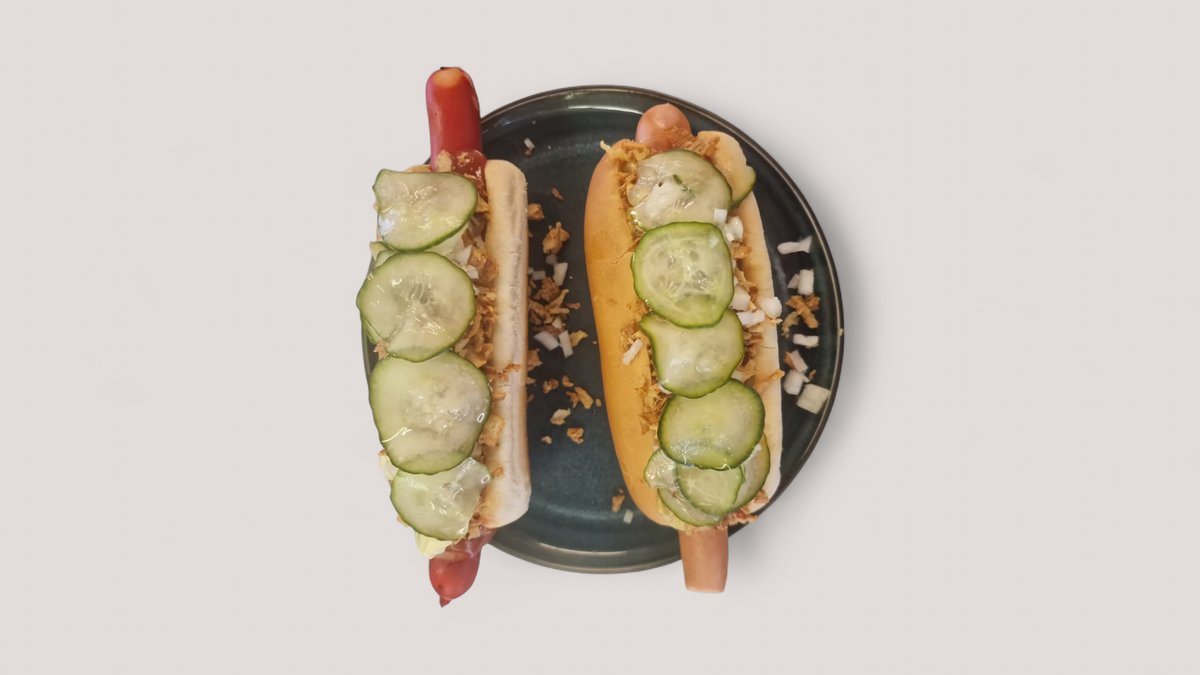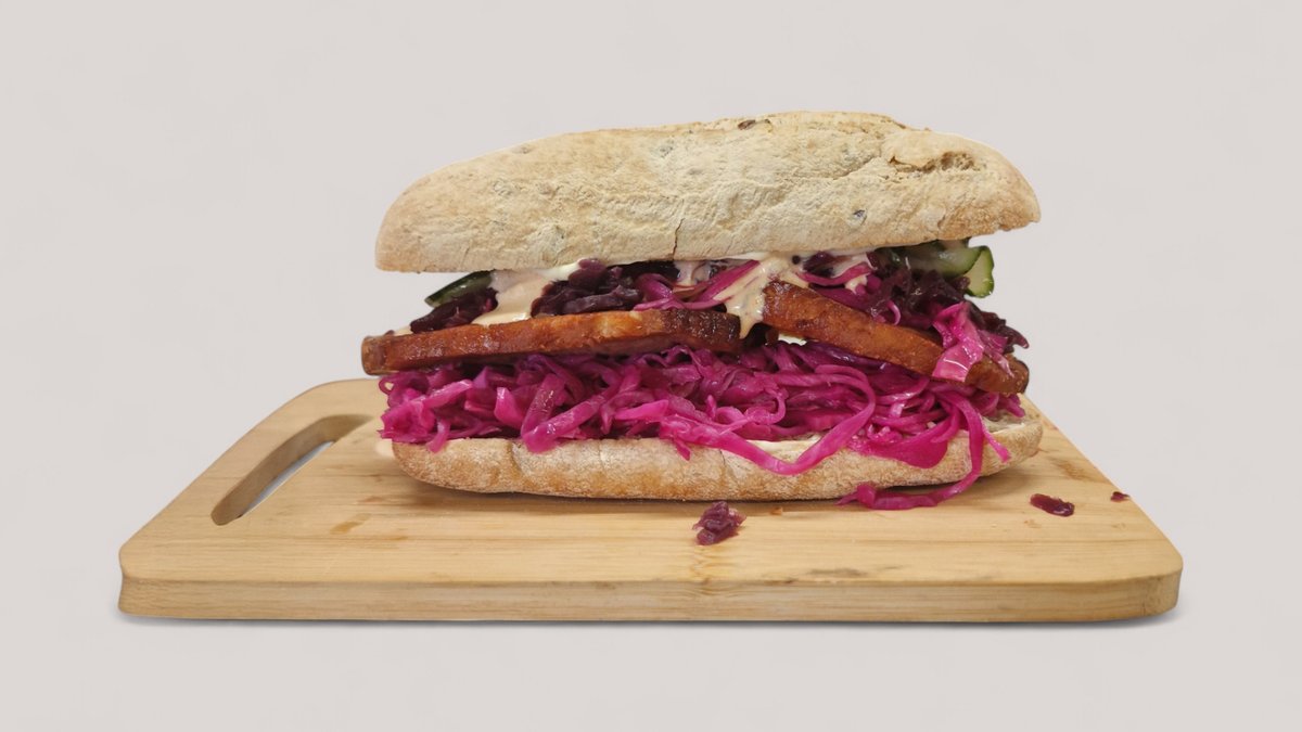 To stykker flæskesteg i brioche bolle med hjemmelavet rødkål, hjemmesyltede agurker, iceberg salat, hjemmelavet dressing og mayonnaise. Serveres med kartofler, dyppelse og en valgfri drikkevare.