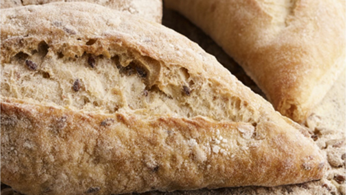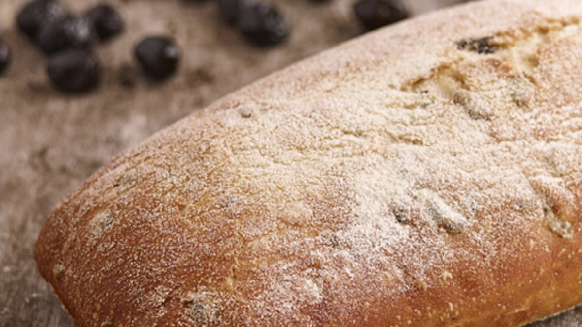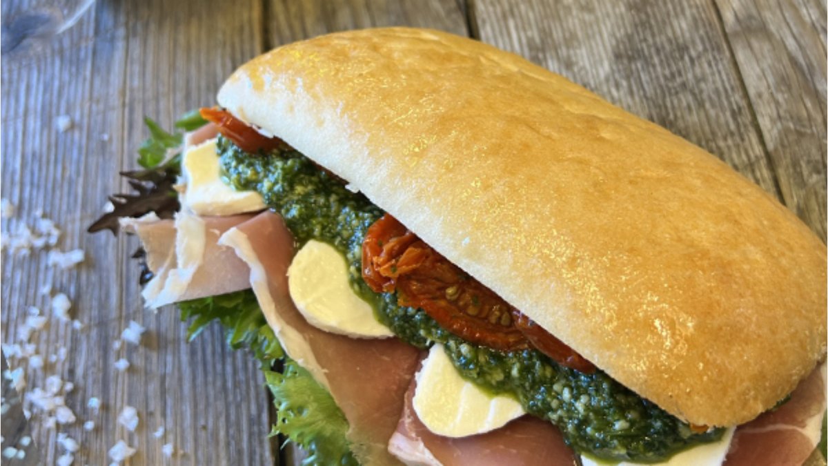 Ciabattabrød med fyld af lufttørret skinke, mozzarella, salat, semitørret tomat og hjemmelavet pesto.