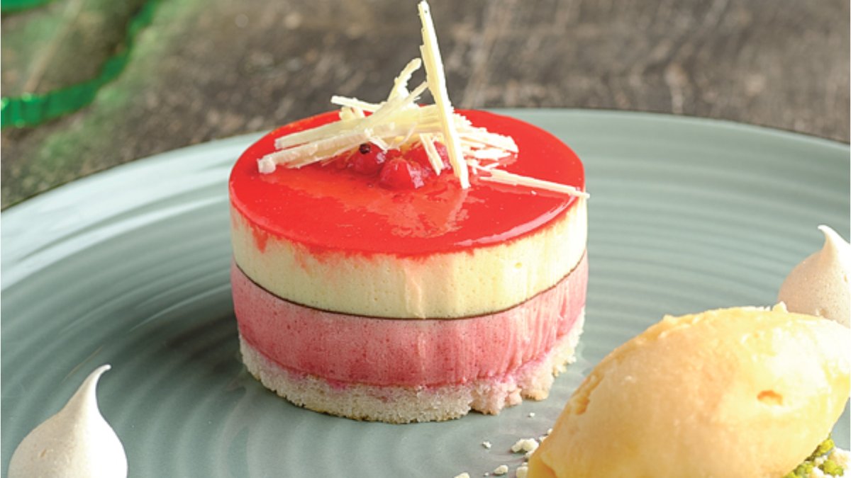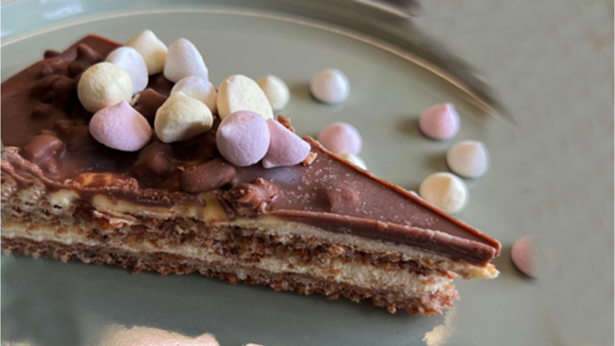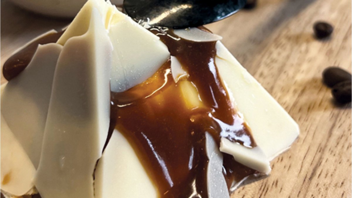 Pyramidekage med hvid chokolademousse og flødekaramel.