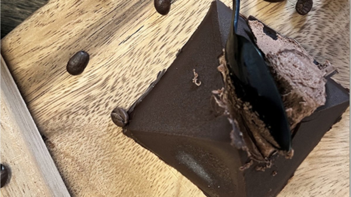 Pyramidekage med mørk chokolademousse og mandelcookie.