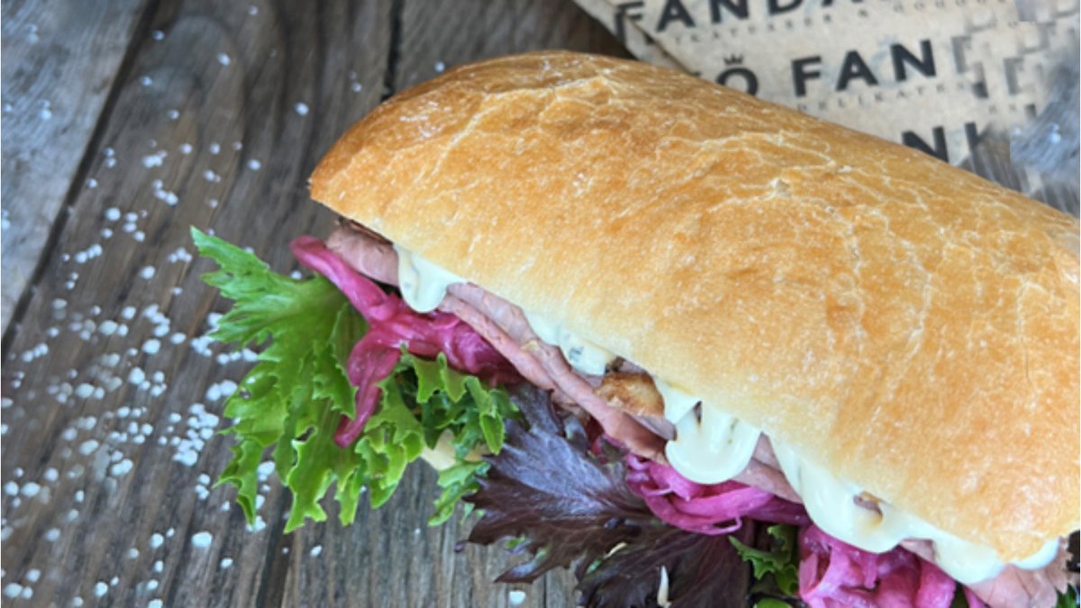 Sandwichbrød med fyld af oksekød, salat, friterede og syltede løg og bearnaisecreme.