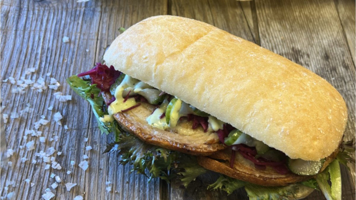 Sandwichbrød med fyld af porchetta-flæskesteg, syltet rødkål, syltede agurker, salat og dressing.