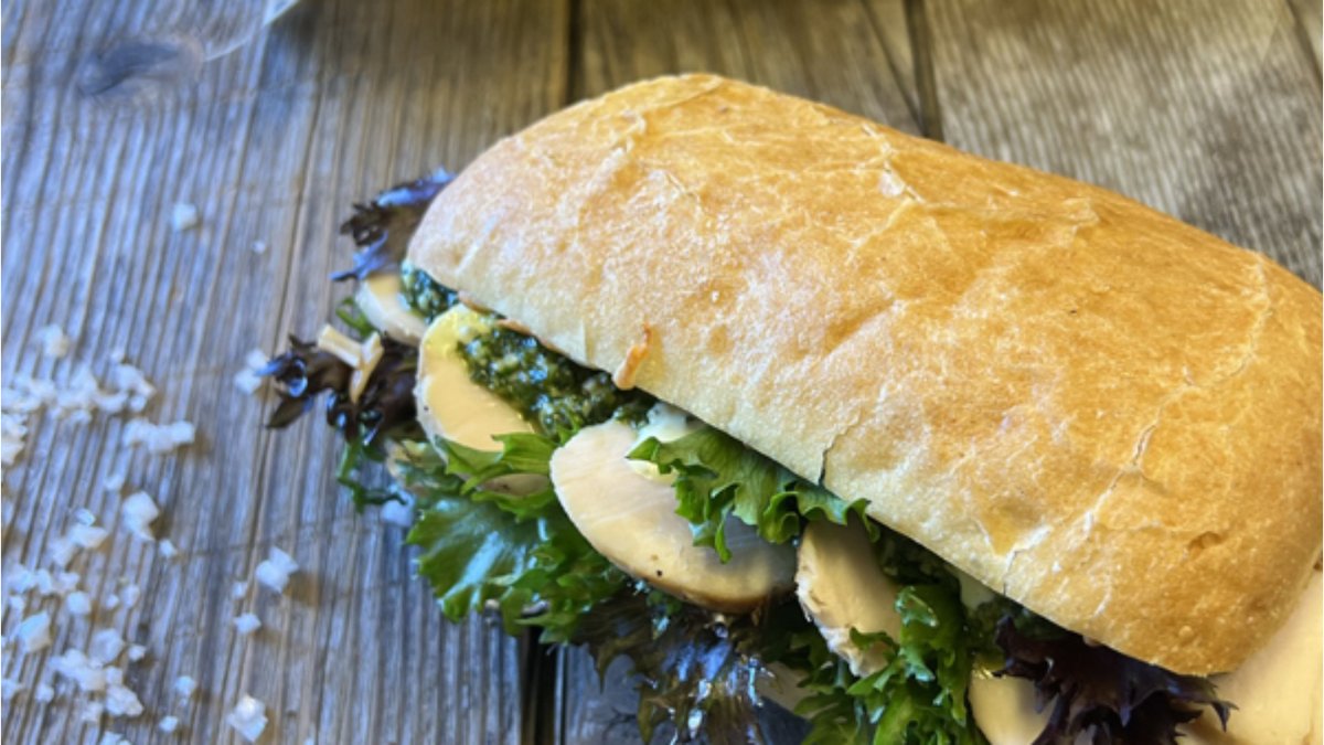 Ciabattabrød med fyld af kylling, salat, gratineret mozzarella, basilikumcreme og hjemmelavet pesto.