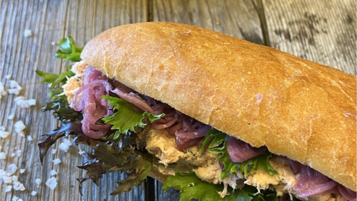 Sandwichbrød med fyld af varmrøget laks, syltede rødløg, salat, krydderurter og hjemmelavet lakse-creme.