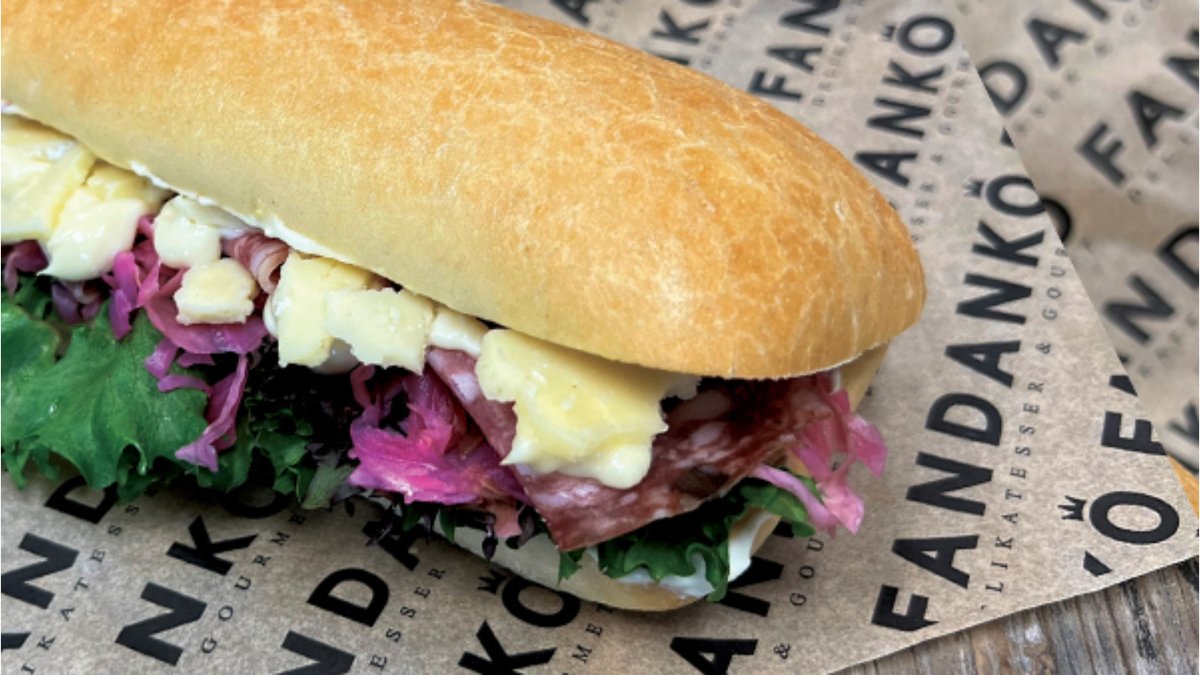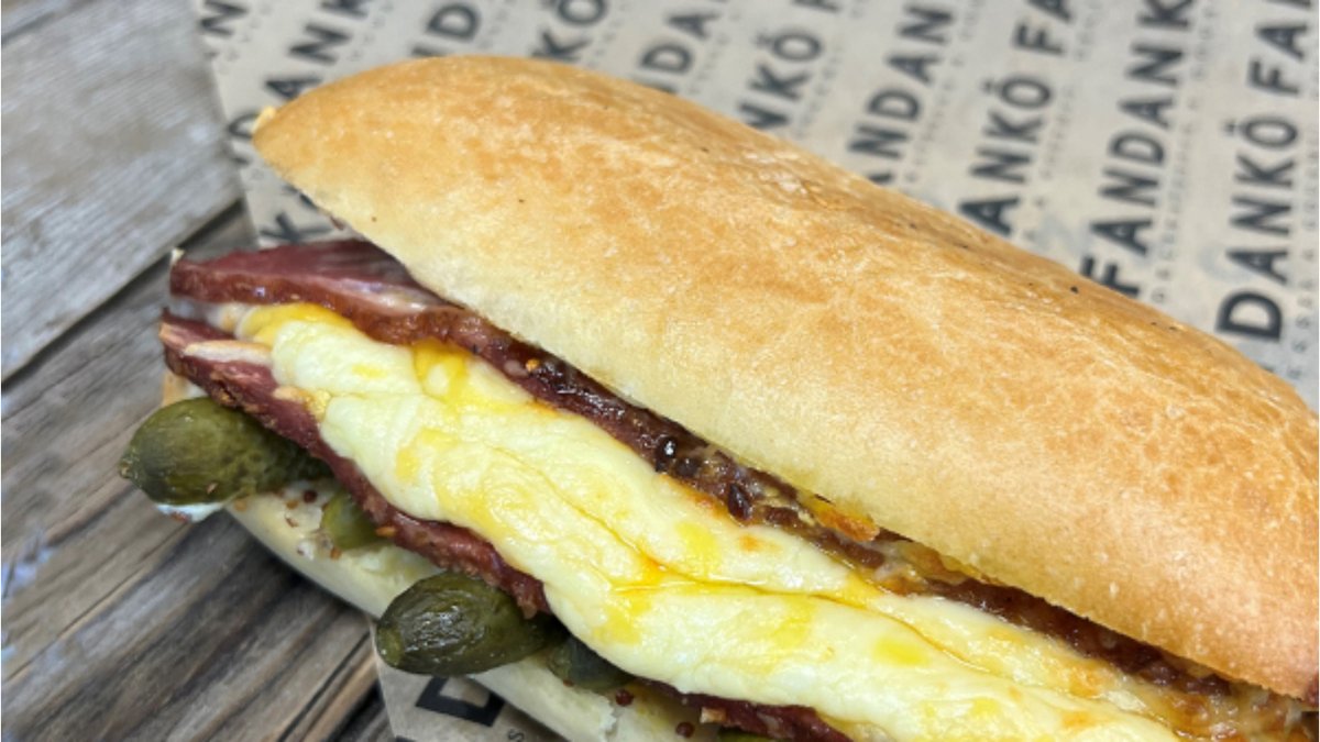 Sandwichbrød med fyld af fire slags ost, pastrami, hot honey, cornichoner og sennepsmayonnaise.