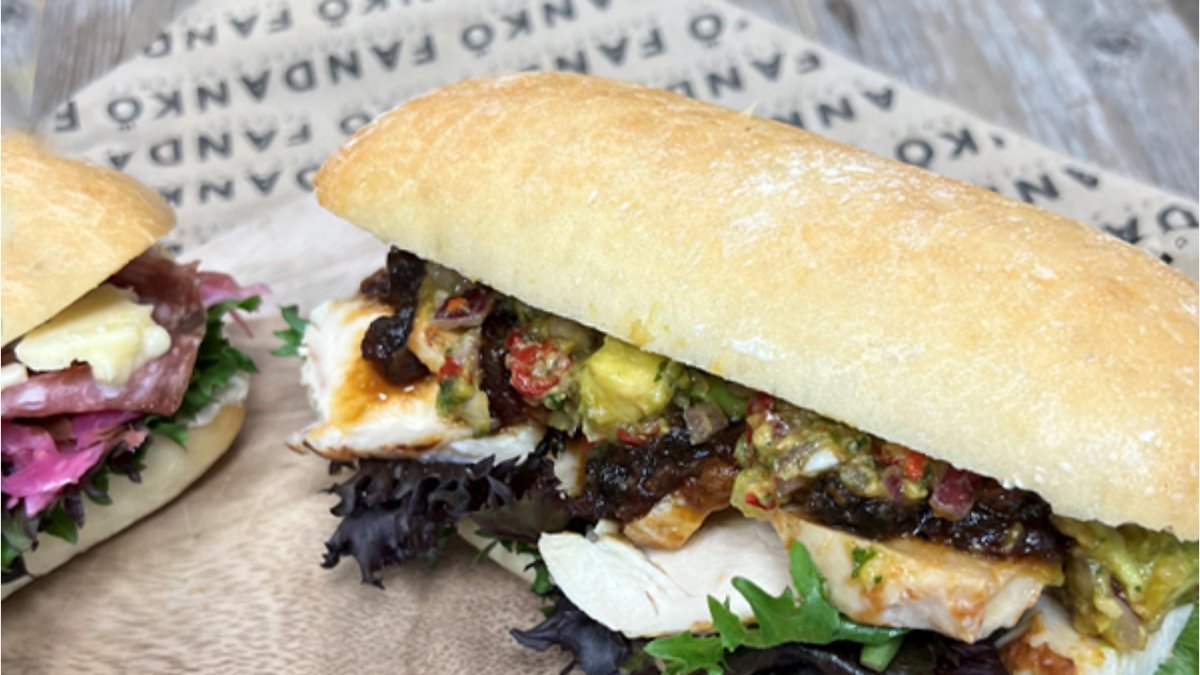 Lyst ciabattabrød med fyld af kylling, salat, hjemmelavet bacon-jam og spicy avocado.