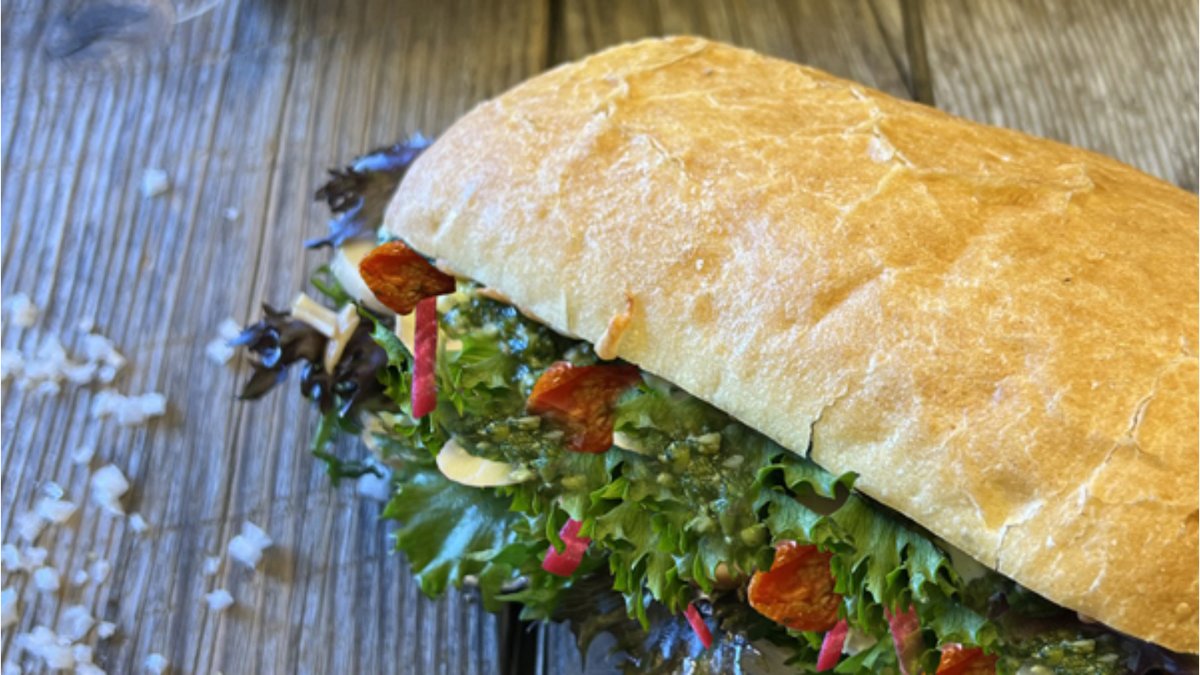 Sandwichbrød med fyld af hjemmesyltede grøntsager. mozzarella, salat og hjemmelavet pesto.