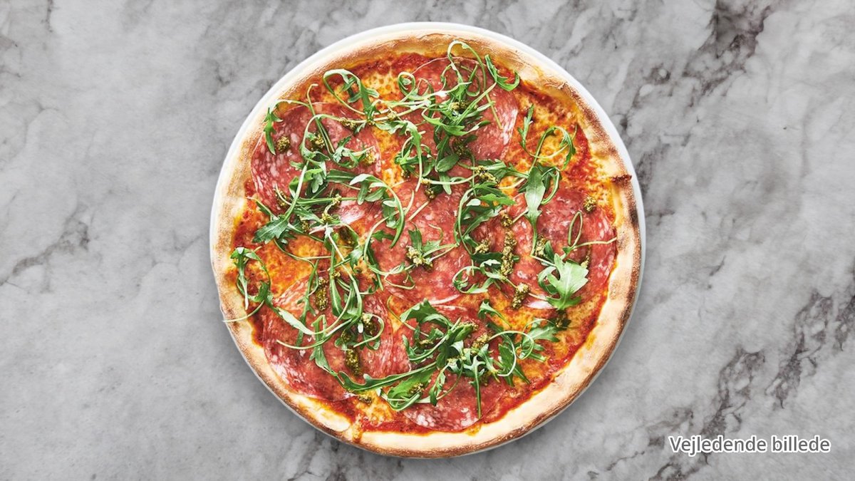 Med tomatsauce, ost, sort oliven, Italiensk salami, løg og oregano.