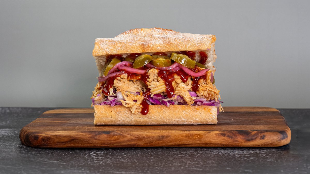 BBQ-marnieret Pulled kylling i surdejsbrød, hjemmebakset spidskålssalat, barbequesauce, syltede rødløg og gulerødder, krydderurtedressing og jalapeños for ekstra spark. Serveres med valgfri 0,25 l Frem sodavand.