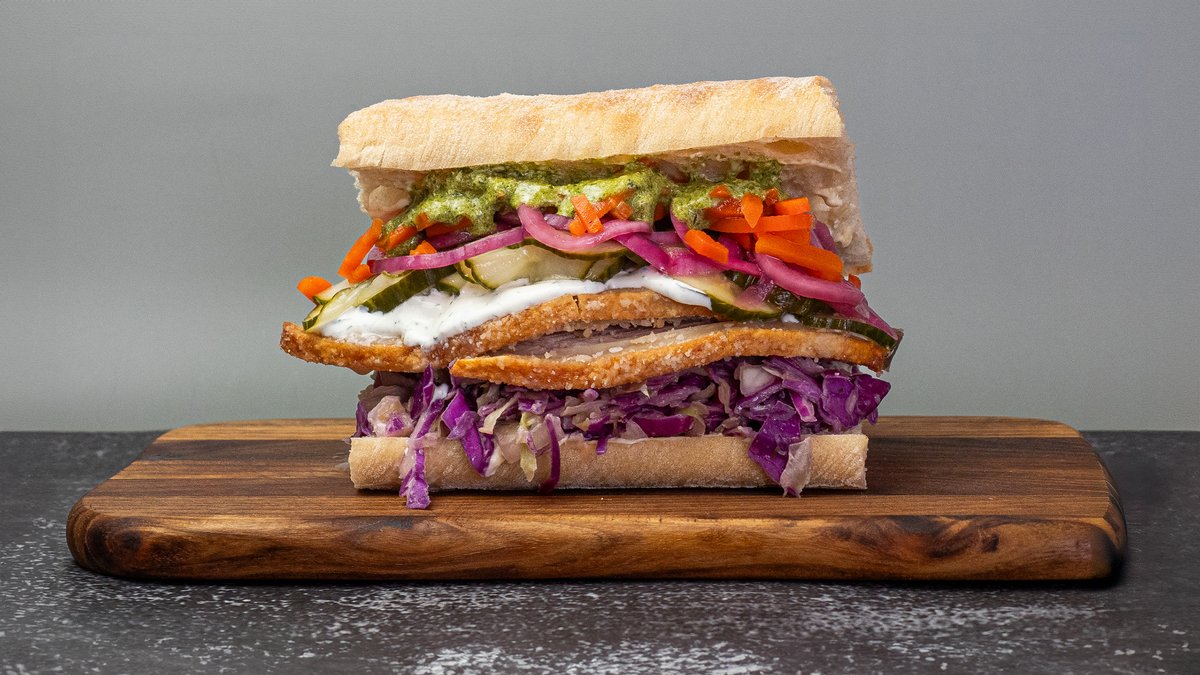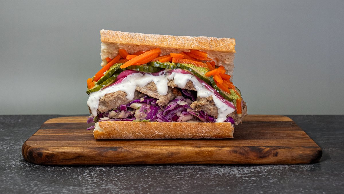 Langtidsbraisseret kalvespidsbryst på en bund af finthakket rødkålssalat med et skud krydderurtedressing, chimmichurridressing, smeltet goudaost, syltede rødløg. På surdejsbrød med chipotlemayo.