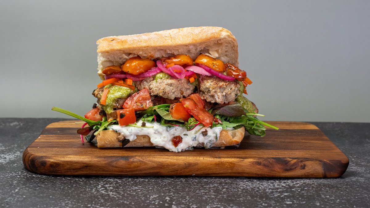 Græske frikadeller i durum-surdejsbolle, hjemmerørt tzatziki med smæk på, semi-dried tomater og græsk tomatsalat. Serveres med valgfri 0,25 l Frem sodavand.