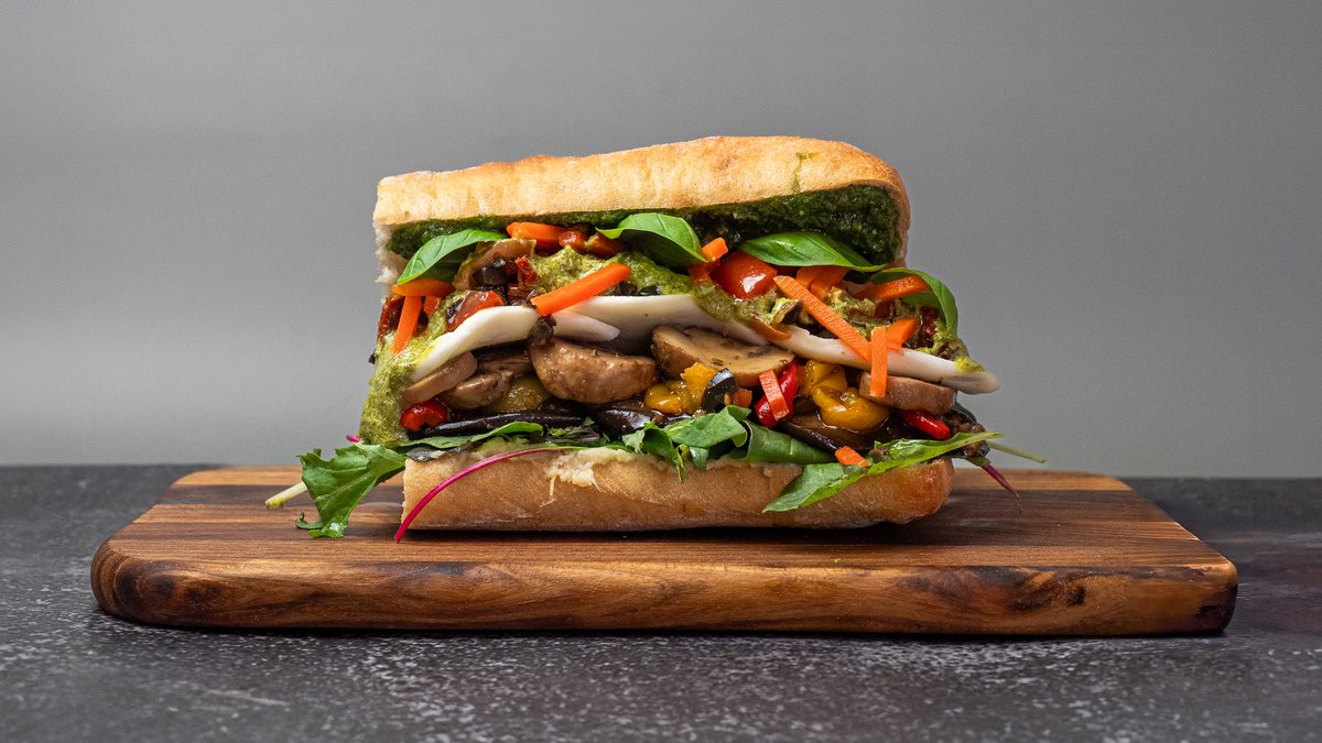 Dagens velsmagende grøntsager i sandwichbrød, syltede rødløg, semidried tomater, mozzarella og pesto med vesterhavsost. Serveres med valgfri 0,25 l Frem sodavand.