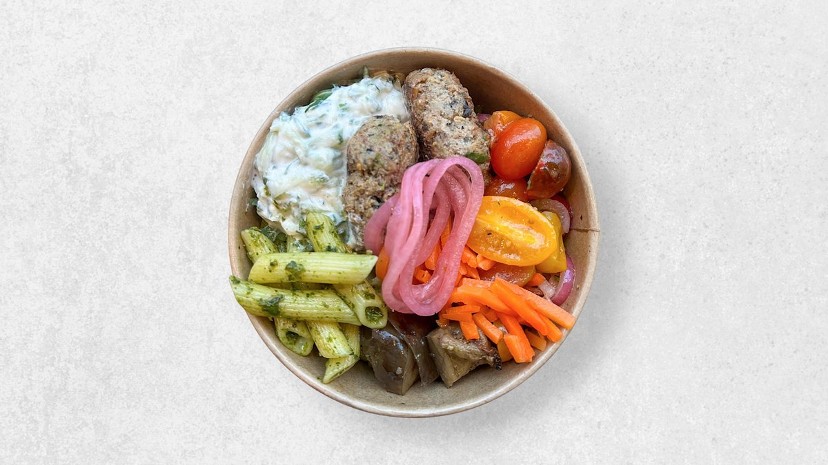 Tzatziki, tomatsalat, grøn pasta, græske frikadeller, syltede rødløg, syltet gulerod og aubergine på en bund af napolitaner salat. Serveres med én valgfri sodavand.