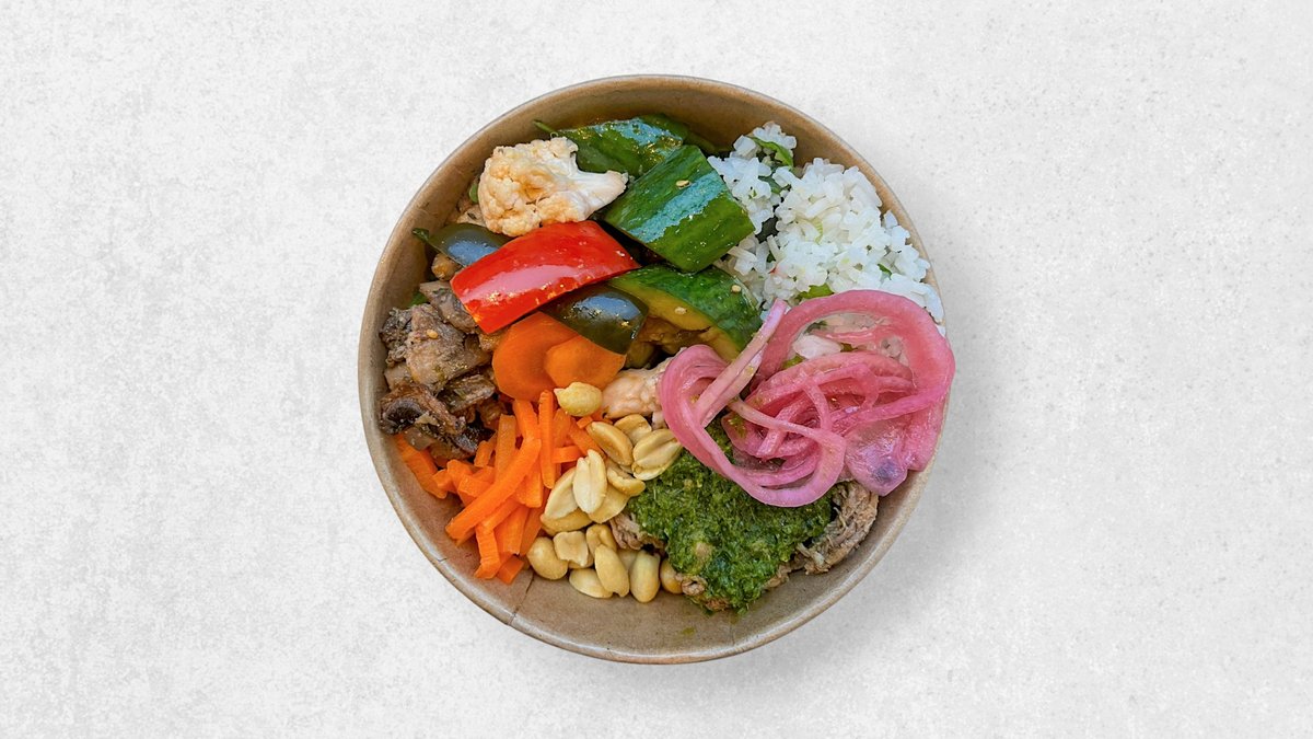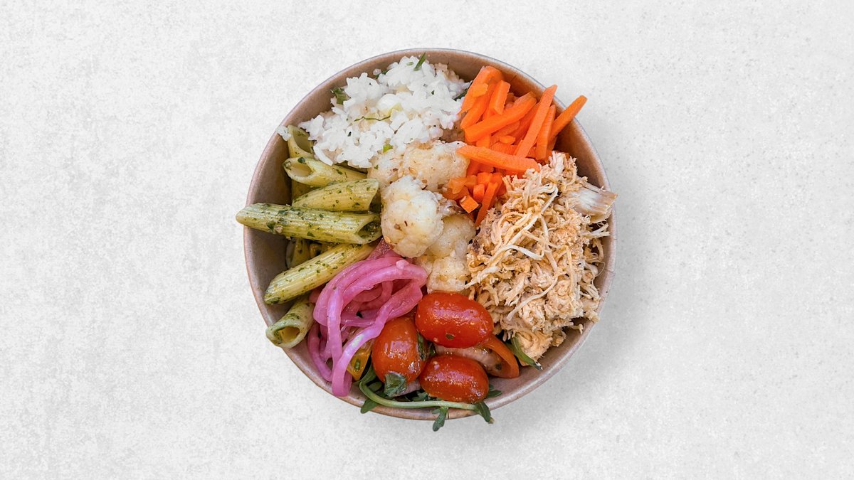 Kylling, Thai-ris og pestopasta, tomatsalat med rødløg, basilikum og balsamico, ristet blomkål, syltede rødløg, gulerod og valgfrit tilbehør på en bund af napolitanersalat. Serveres med én valgfri sodavand.
