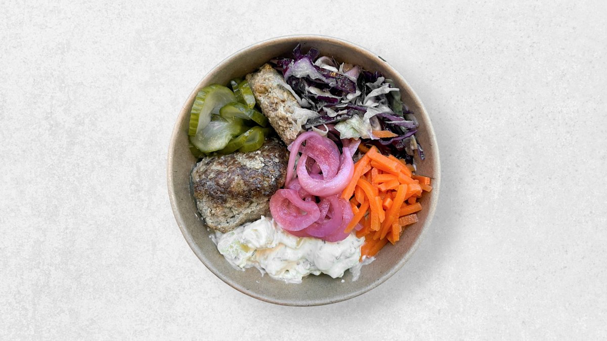 Kartoffelsalat, frikadeller, spidskålskålsalat vendt i sennepsdressing, syltede agurker, gulerod, rødløg og ranch på en bund af napolitanersalat. Serveres med én valgfri sodavand.