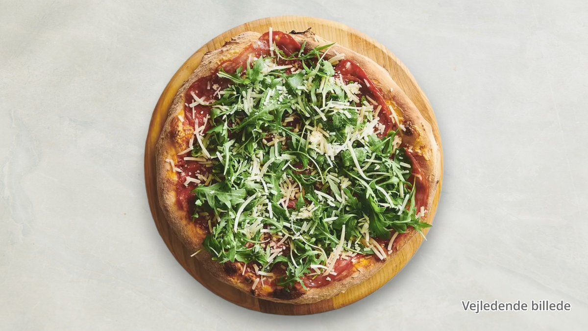 Tomatsauce, ost, mascarpone, spinat, napolitansk salami, rucola, parmesanost, pesto og oregano.