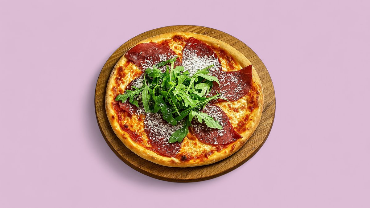 Tomatsauce, ost, mozzarella, bresaola, rucola, parmesan og oregano.