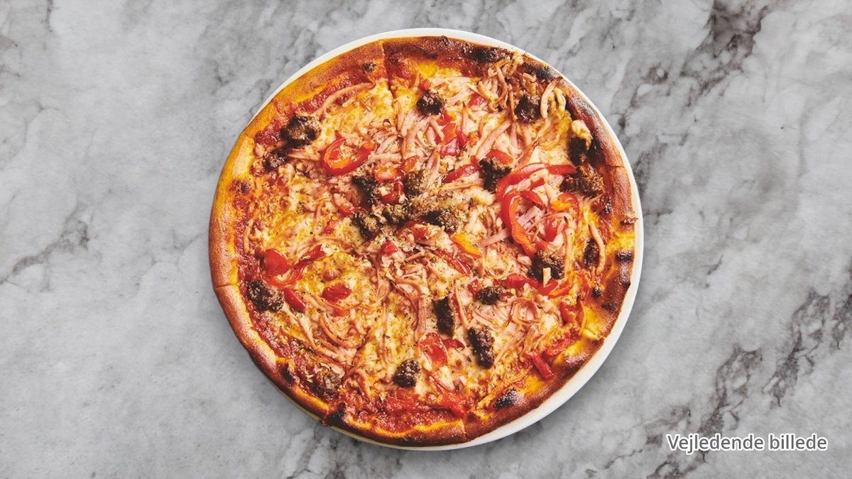 Tomatsauce, ost, mozzarella, kogt skinke, pepperoni, cocktailpølser, bearnaisesovs, bæger tomatsauce og oregano.