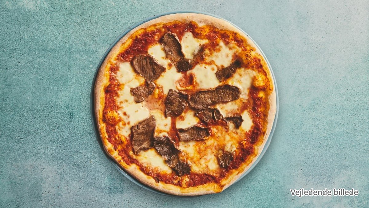 Tomatsauce, ost, mozzarella, skiveskåret marineret kalvefilet, løg, svampe, bearnaisesauce og oregano.