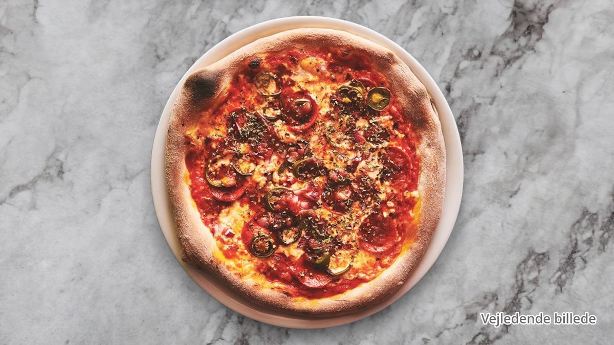 Tomatsauce, ost, mozzarella, kogt skinke, hakket oksekød, pepperoni, løg, hjemmelavet chili og oregano.