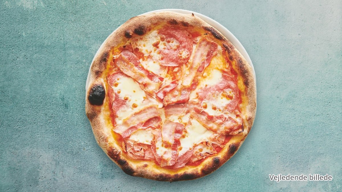 Tomatsauce, ost, mozzarella, kogt skinke, pepperoni, cocktailpølser, bacon og oregano.