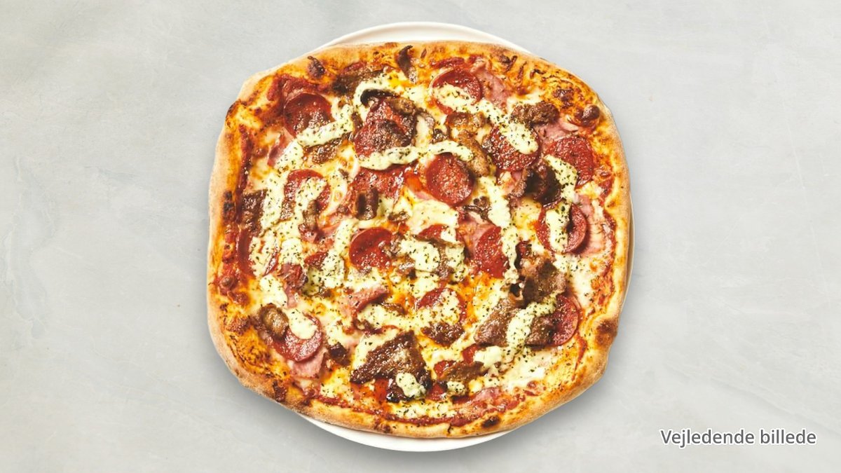 Tomatsauce, ost, mozzarella, kogt skinke, kebab, hakket oksekød, pepperoni, cocktailpølser, bacon, hvidløg og oregano.