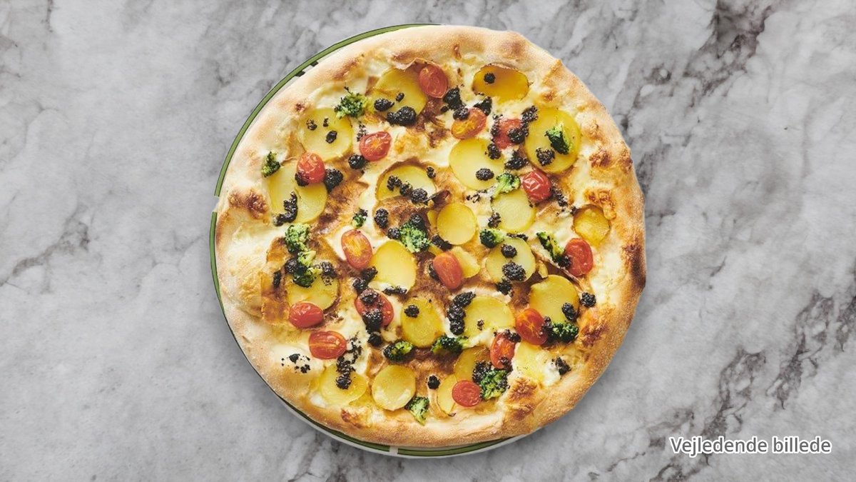Ost, mozzarella, mascarpone,(tynde skiver kalvekød) kartofler, broccoli, soltørret tomater, trøffelsauce og oregano.
