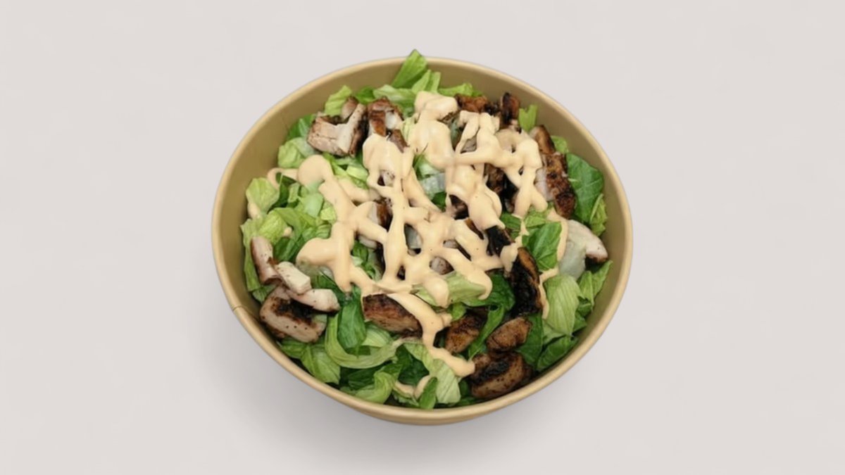 Frisk salat med saftig kylling og vores cremede hjemmelavede sauce.