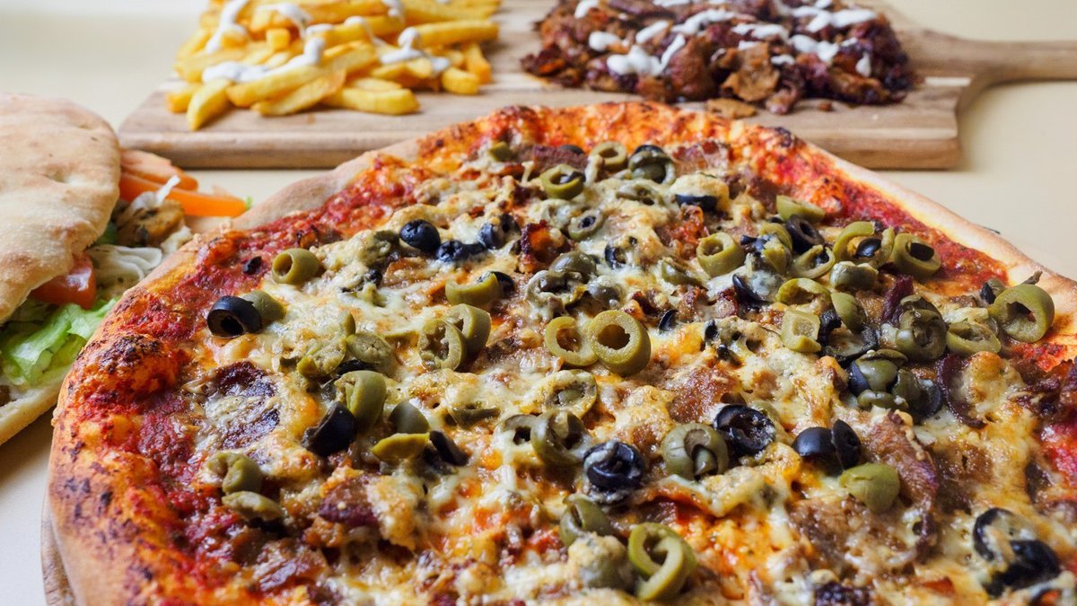 Tomatsauce, ost, kebab, oliven, hvidløg oregano.