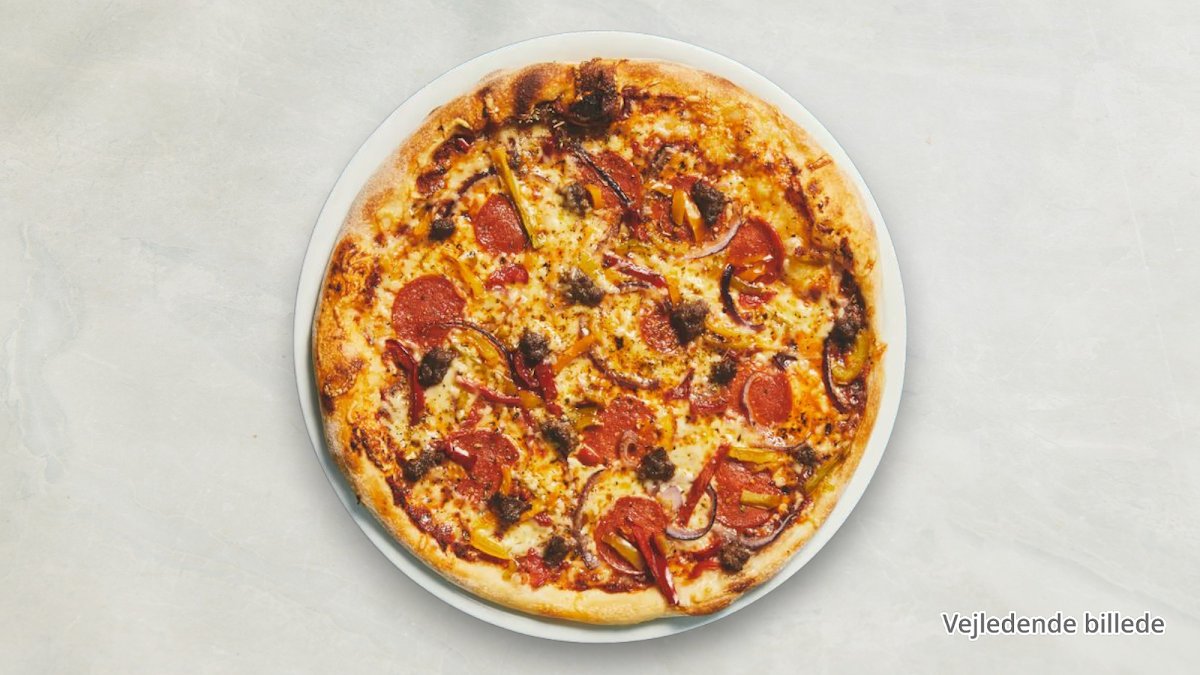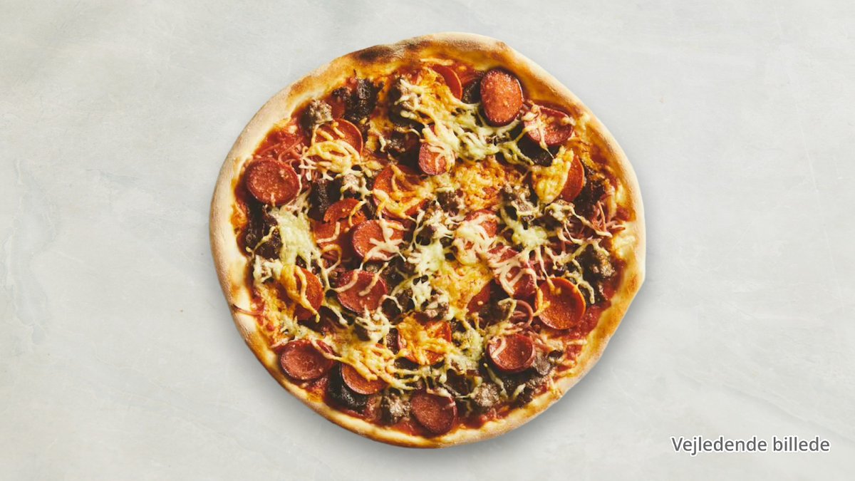 Chilisauce, ost, pepperoni, kebab, cocktailpølser, oksekød og jalapeno.