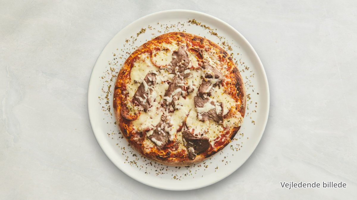 Tomatsauce, ost, skinke, oksekød og bearnaisesauce.