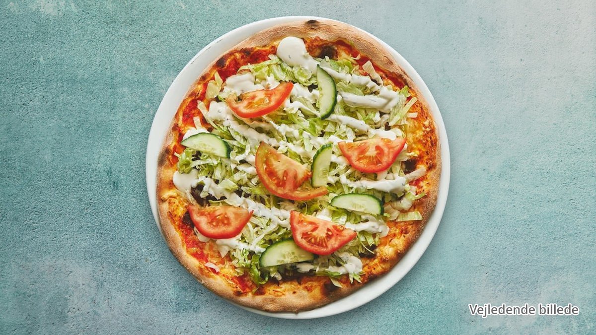 Tomatsauce, ost, pepperoni, kebab, løg, salat, tomat, agurk og dressing.