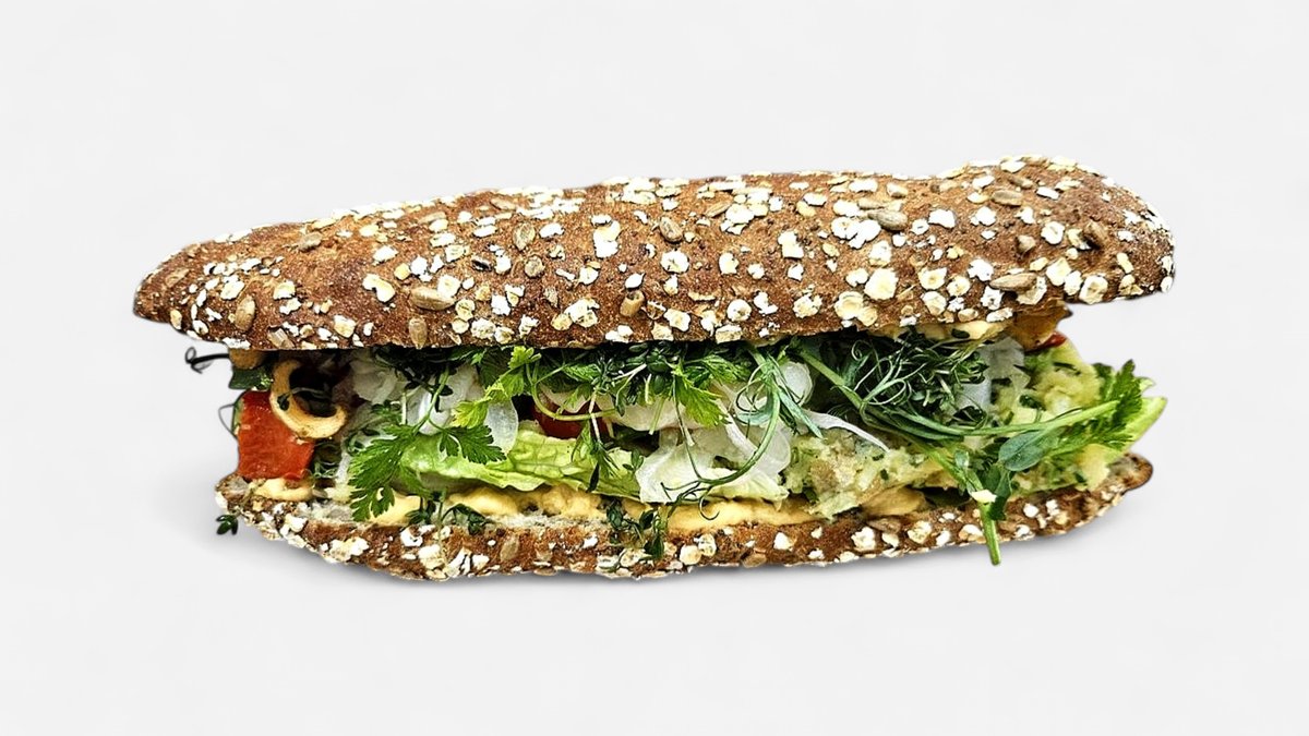 Ristet focaccia med stegt rødspættefilet, håndpillede rejer, estragonmayo, syltet gulerod, broccoli, bagt tomat, sprøde jordskokker.