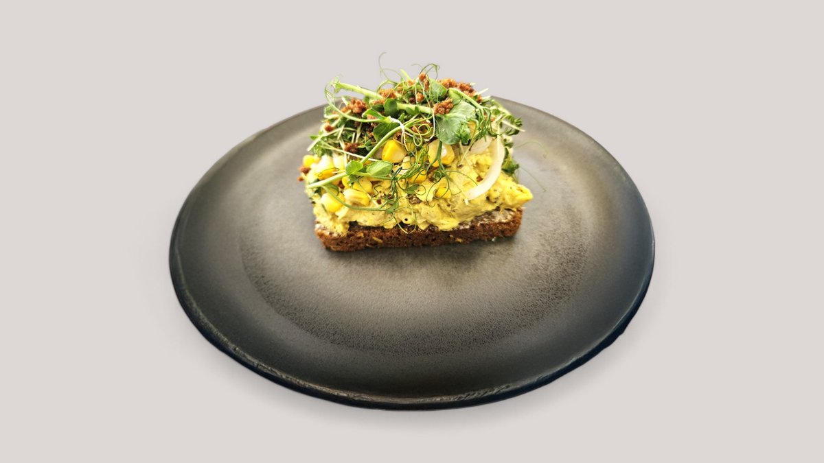 Smilende skøn. Rugbrød med æg, jordskokkepure, bagt tomat, syltet kål, krummer.