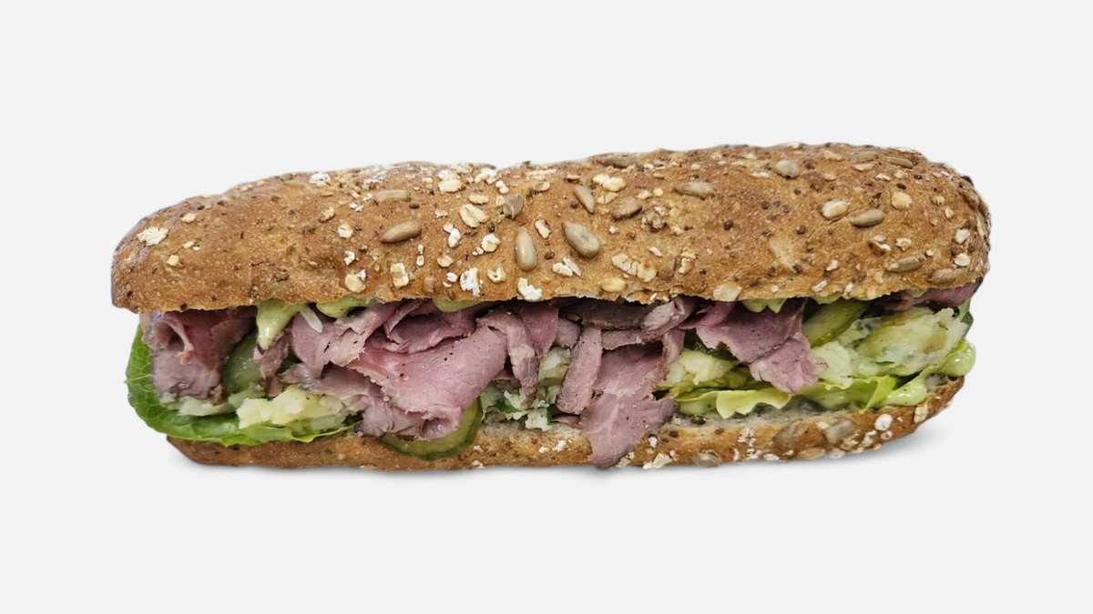 Moden og lækker. Rugbrød med oksekødsskiver, hokkaido, svampe, syltet agurk, tyttebær, sprøde løg.