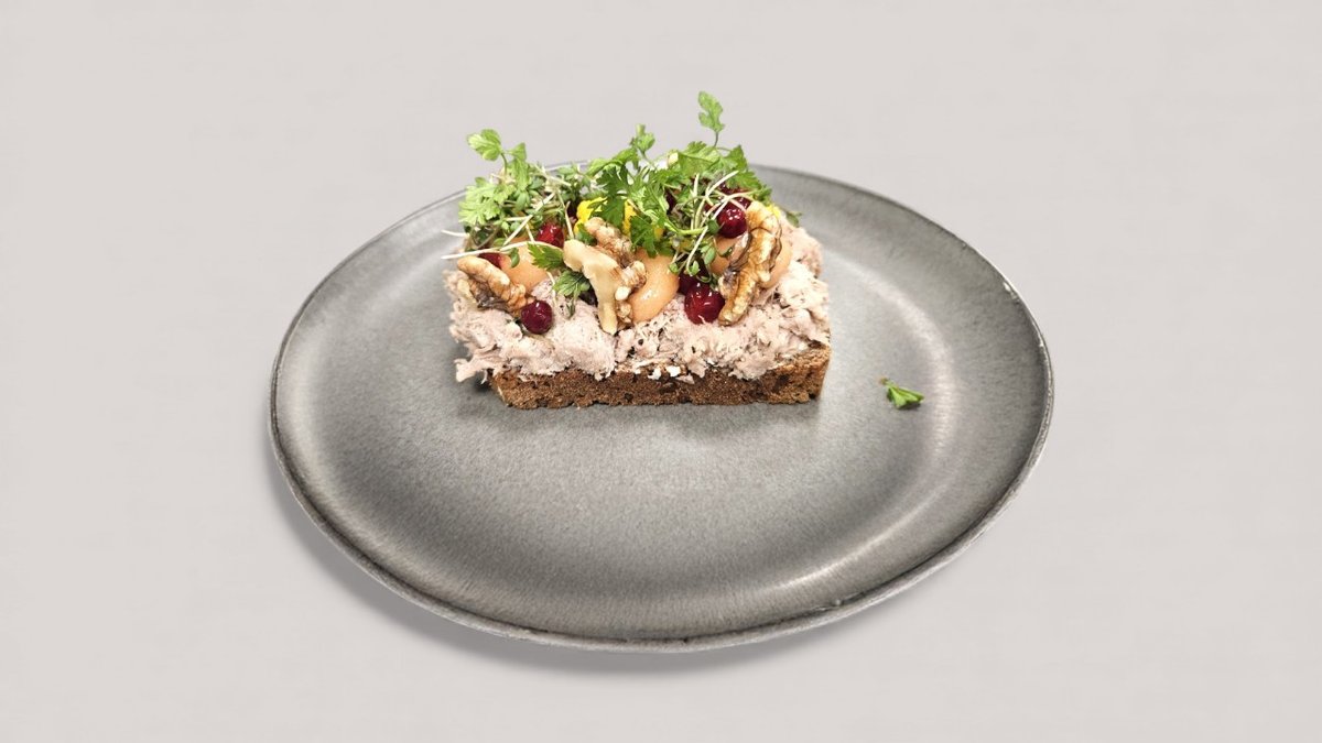 Cremet og dejlig. Rugbrød med kylling salat, persille, æble, syltet salatløg, baconknas.